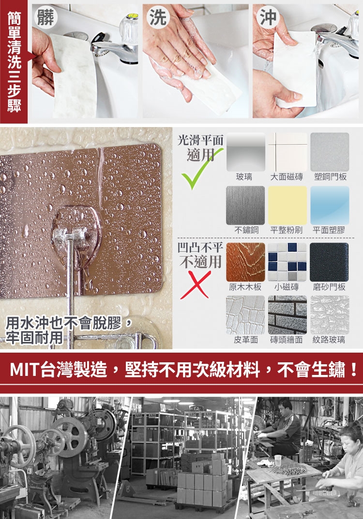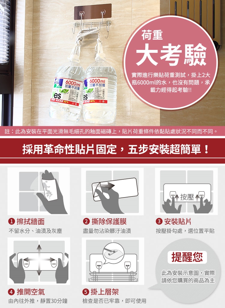 4.請勿安裝於不平整、不規則、粗糙及脆弱易脫皮之表面,以免商品掉落。
