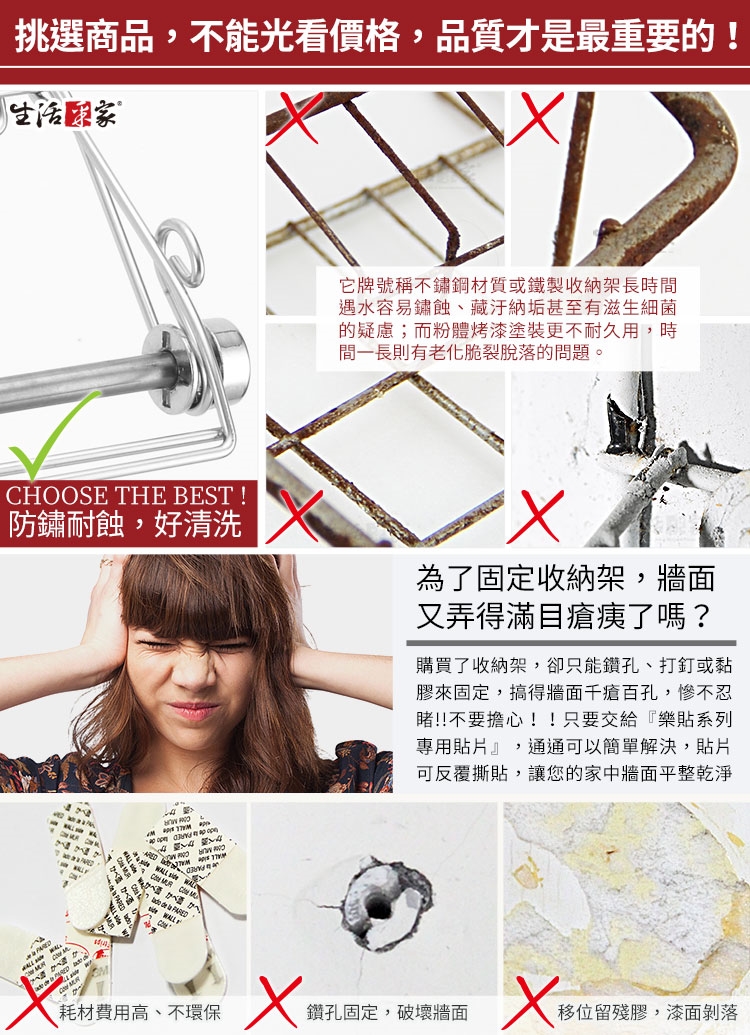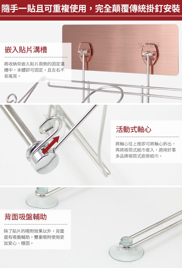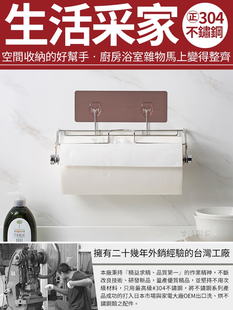 台灣自製優良商品又來了!!革命性新世代商品,【生活采家樂貼系列304不鏽鋼收納架】完全顛覆傳統掛釘安裝,不須打釘、不用鑽孔,免除繁雜的安裝手續,隨手一貼即可強力附著在平整光滑的牆面,貼片搭配各式功能304不鏽鋼架,可用於家中廚房、衛浴等場所,實用性廣,不鏽鋼製品二十幾年外銷經驗,商品深受歐美日等地區肯定,堅持不用次級材料,只選用正統高級#304(18-8)不鏽鋼,品質好不會生鏽,絕對是您生活中的不二選擇!!