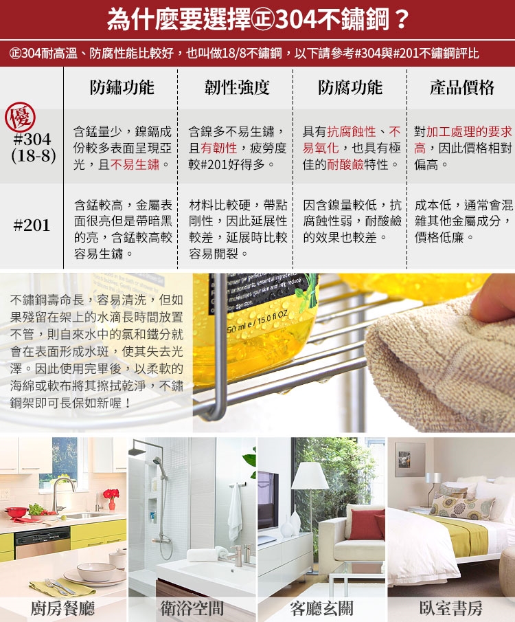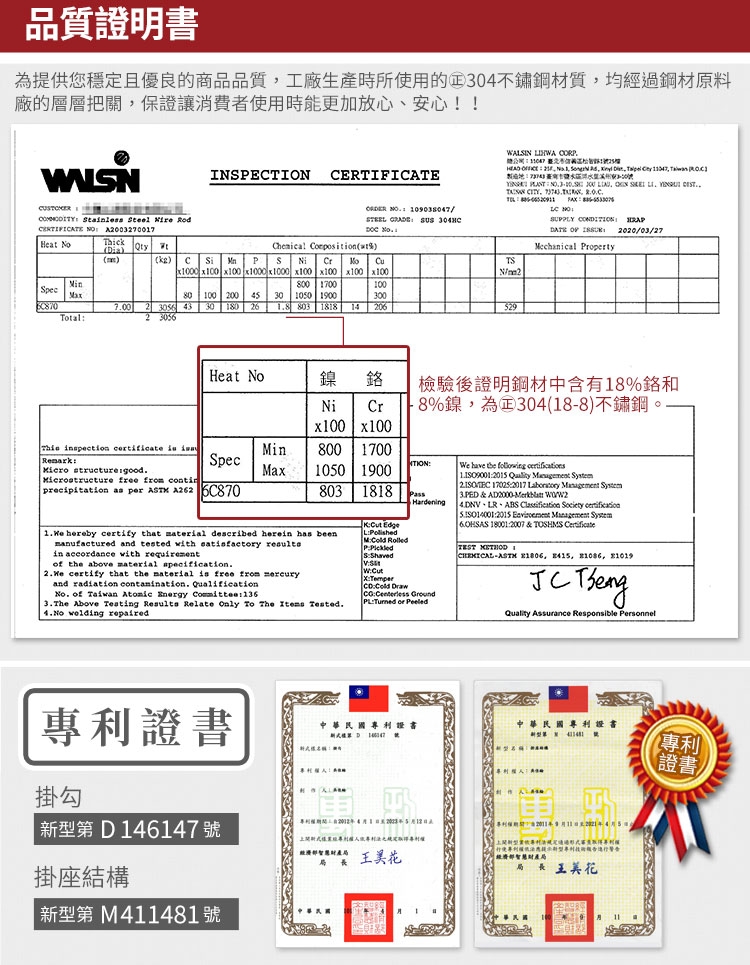 採SUS304 (18-8)高品質不鏽鋼製造,無生鏽疑慮,為同質性產品能找到的最高使用材料等級 ,製造商為已有二十多年經驗的外銷廠商,品質保證。