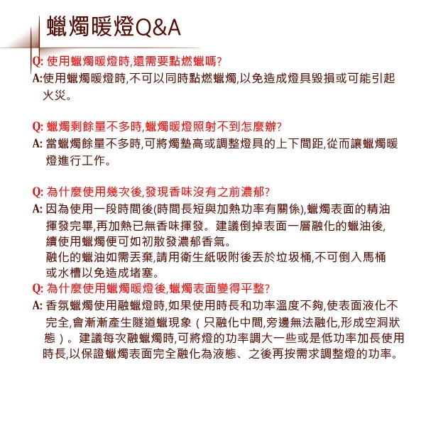 1.融蠟燈使用原理為用燈泡加熱,請不要點燃蠟蠋。