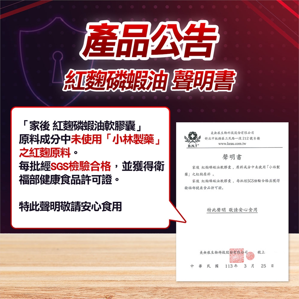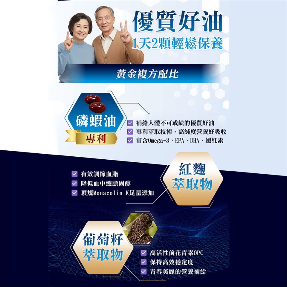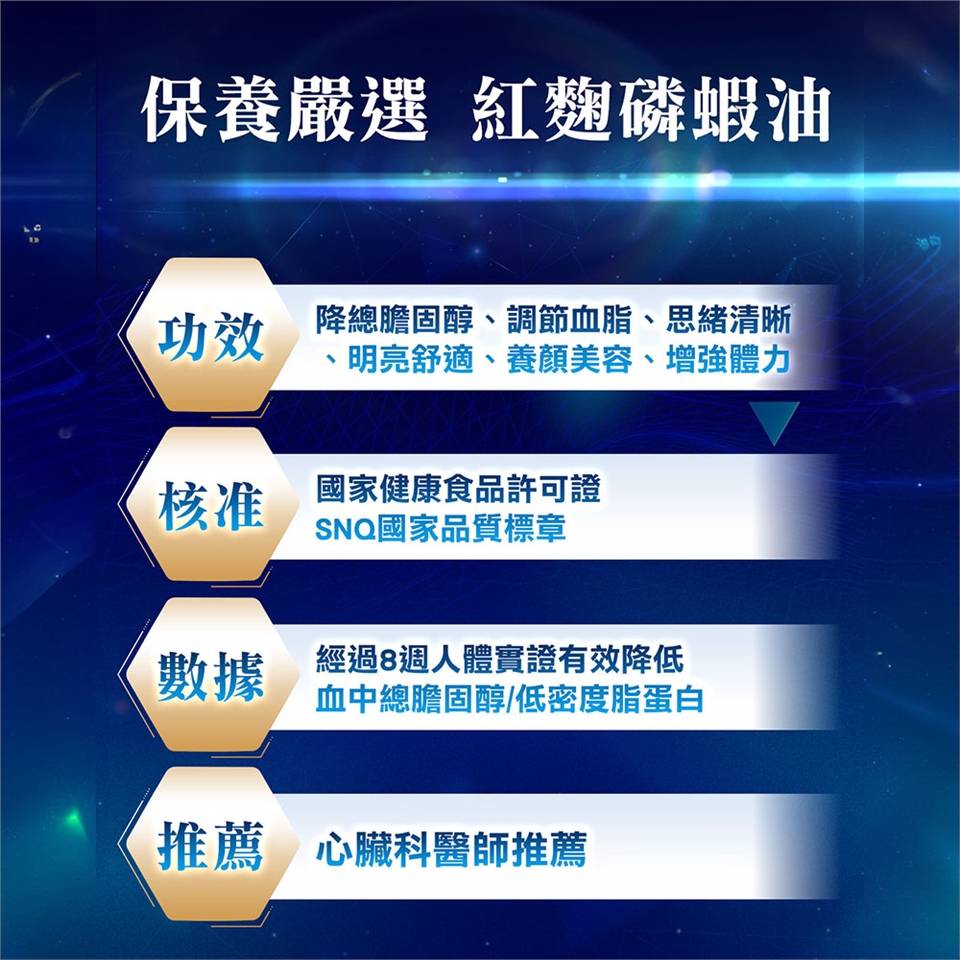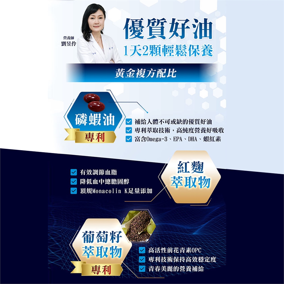 ◆內容物成分:磷蝦油、紅麴萃取物、脂肪酸甘油脂、葡萄籽萃取物、維生素E(抗氧化劑)