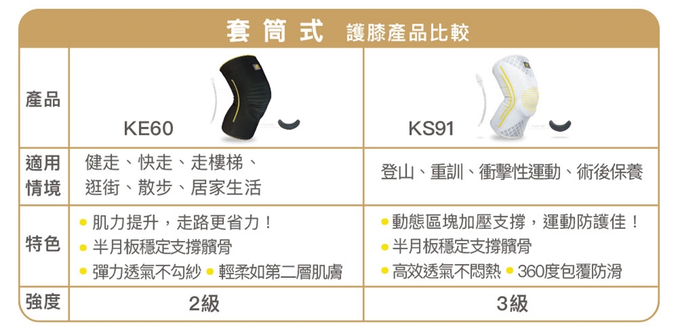 材質輕柔透氣,膝蓋與膝窩採用最新透氣網紗技術,吸濕排汗特別適合台灣濕熱氣候半月形軟墊支撐髕骨
