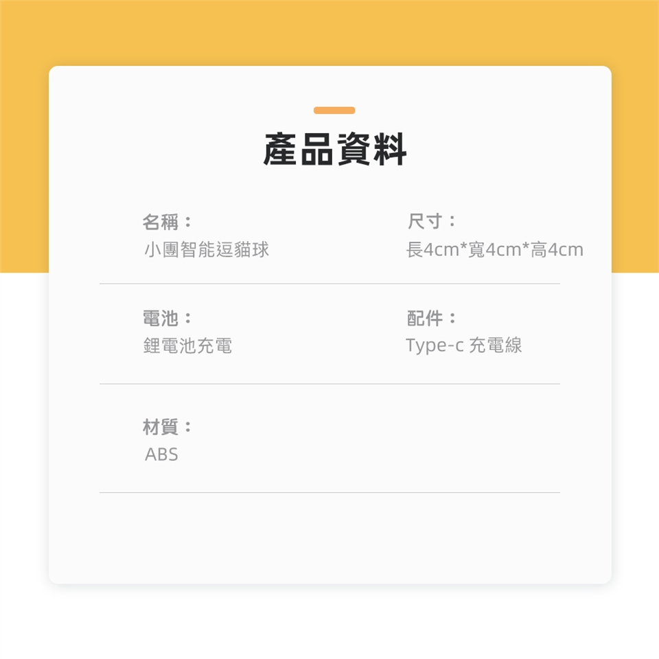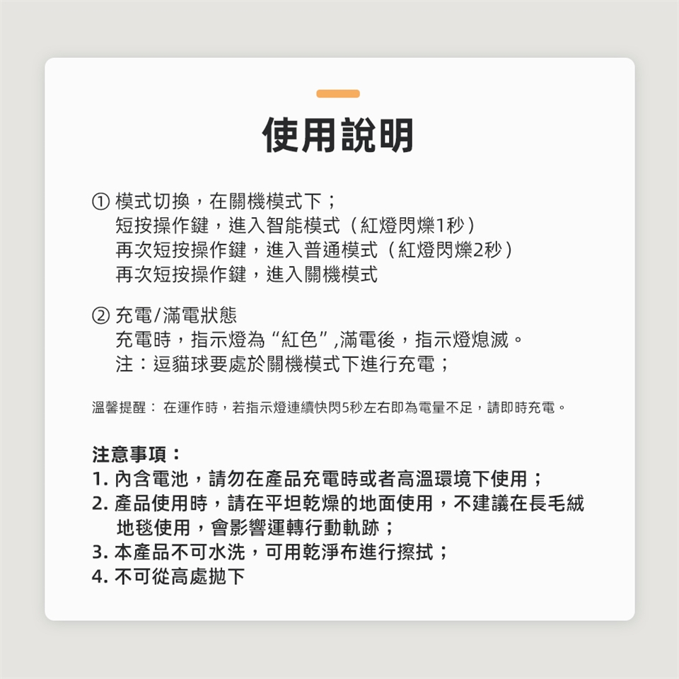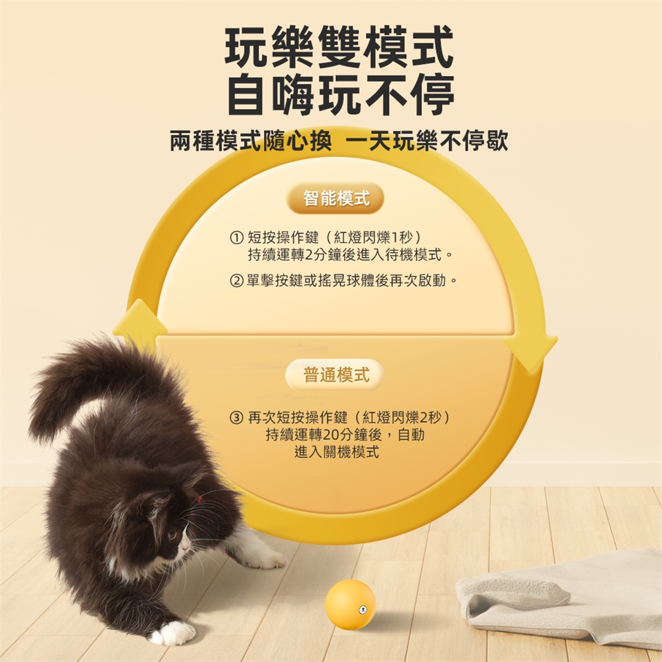 特色:貓咪智能移動逗貓球,兩種遊戲模式-普通與智能雙種模式,激發貓咪狩獵天性;超強長效續航,最長持續娛樂5小時。