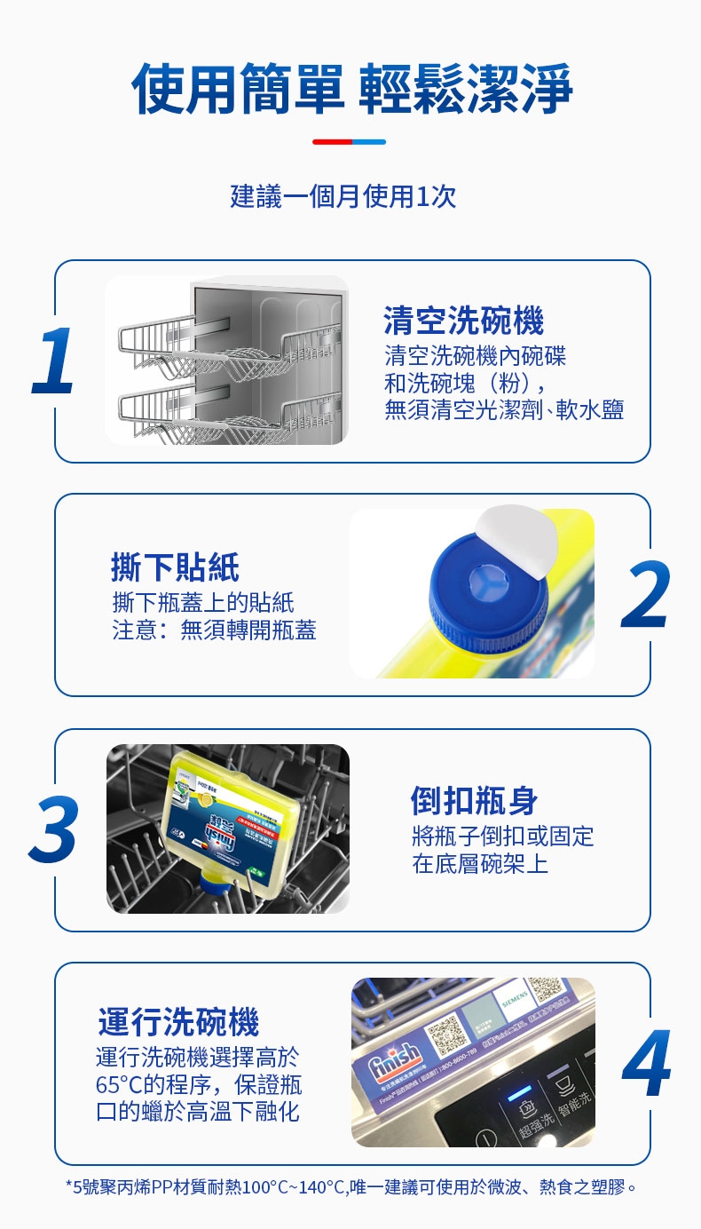 4.請務必使用高溫65度以上的強力洗程(或是機洗洗程)空機運轉一次