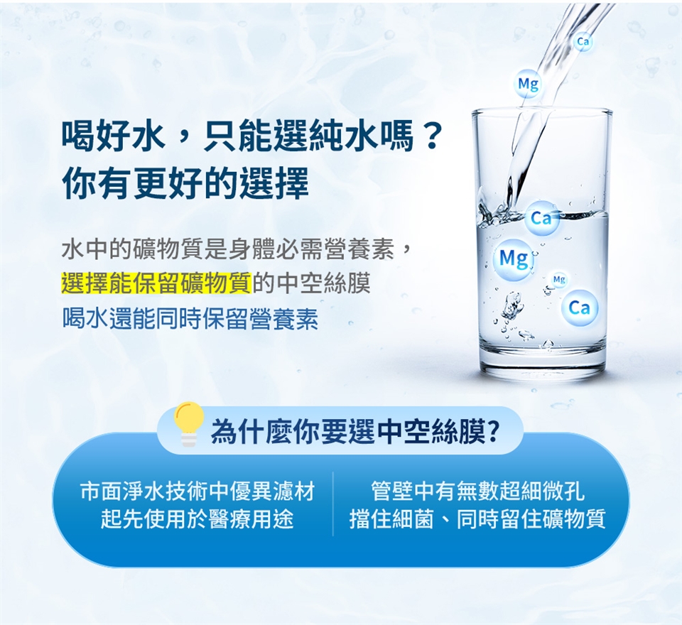 功能:提升飲用水口感、99.99%病毒、硬水軟化、保留有益礦物質