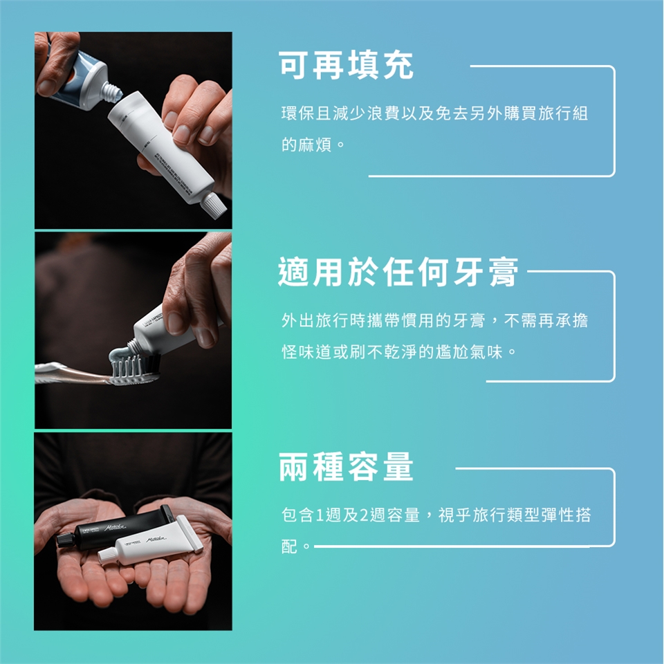 - 兩種規格:1 週和2 週的牙膏量 - 易於清潔,可用洗碗機清洗