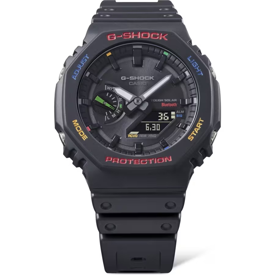 誰說童心與強悍不能並存?多彩繽紛且堅固耐用 G-SHOCK 隆重登場,隨時準備好狂歡玩樂,毫無後顧之憂。 這款腕錶以 GA-B2100 為基礎,保留 GA-2100 獨特的八角造型,搭載智慧型手機連結和 Tough Solar 充電等實用功能。此錶款還採用了碳核心防護構造,以保有與原始型號相似的手腕貼合感。 提供黑、白、綠三種基礎單色,可輕鬆搭配您喜愛的時尚裝扮,而錶圈文字、錶盤元件、時標及 9 點鐘嵌入式錶盤指針則飾以亮紅、藍、黃和綠色點綴。各種元素構成的極簡設計,揮灑五彩繽紛的鮮豔動感,造就獨樹一格的視覺享受。 無論是與朋友相聚出遊,或參加戶外音樂活動,都能以俏皮的休閒風格歡慶快樂時光。