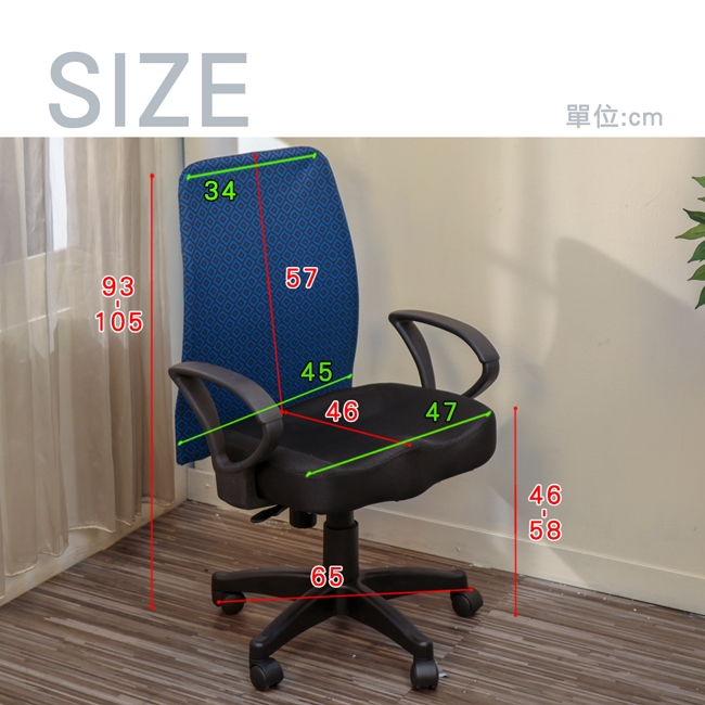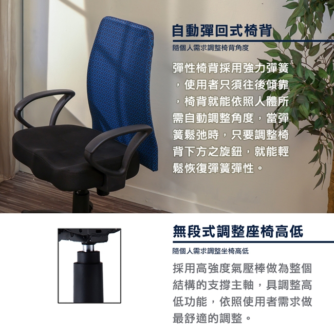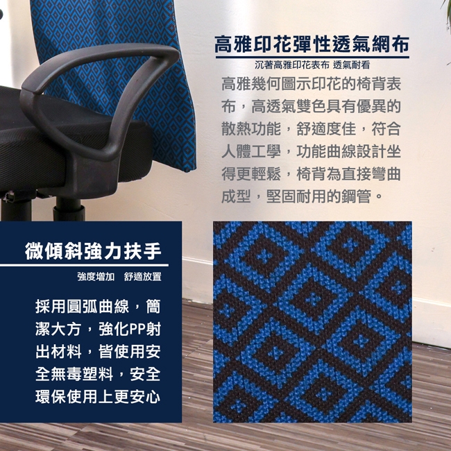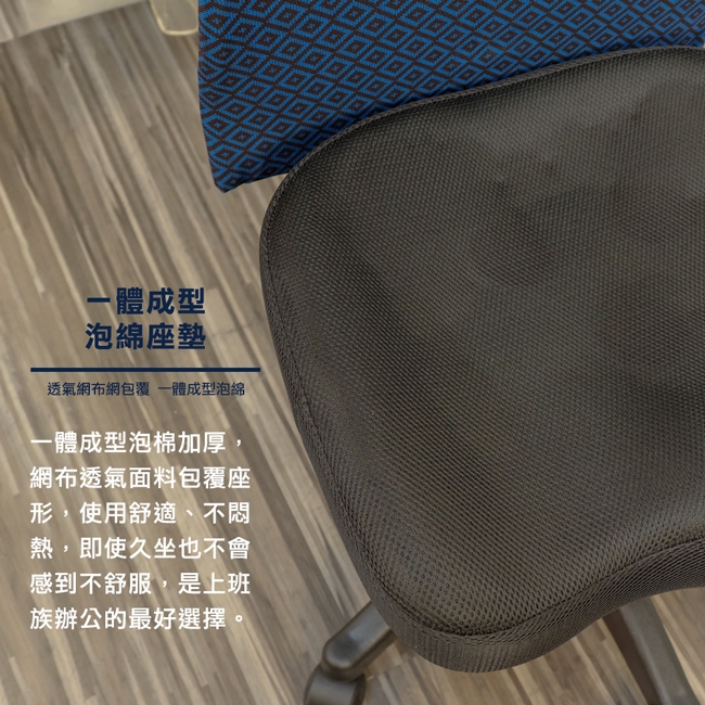 椅背表布採印花透氣網布,略有彈性透氣,經典美觀。一體成型泡綿座墊支撐臀部,坐起來柔軟舒適。