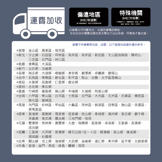 ◎離島及偏遠山區地區,暫無運送服務,敬請見諒!