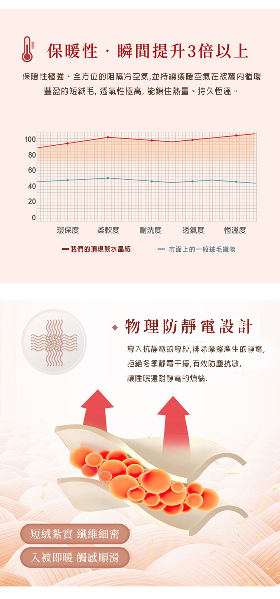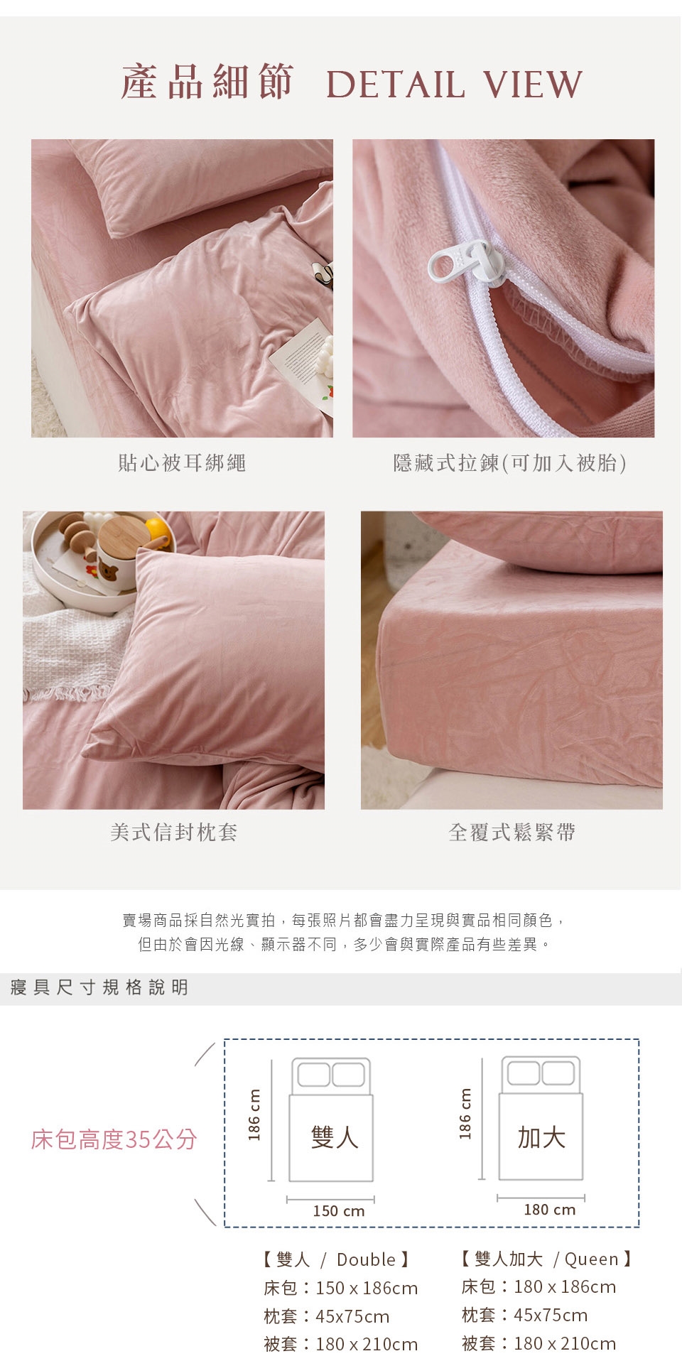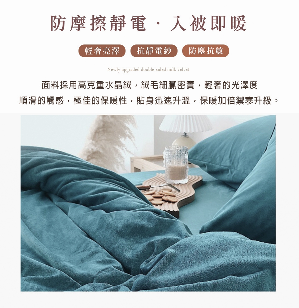 四色優雅純色寢具 超柔軟親膚觸感,豐厚短絨毛,細膩順滑。入被保暖、熱感蓄溫,有效阻隔冷空氣,溫暖冷冷的冬天。
