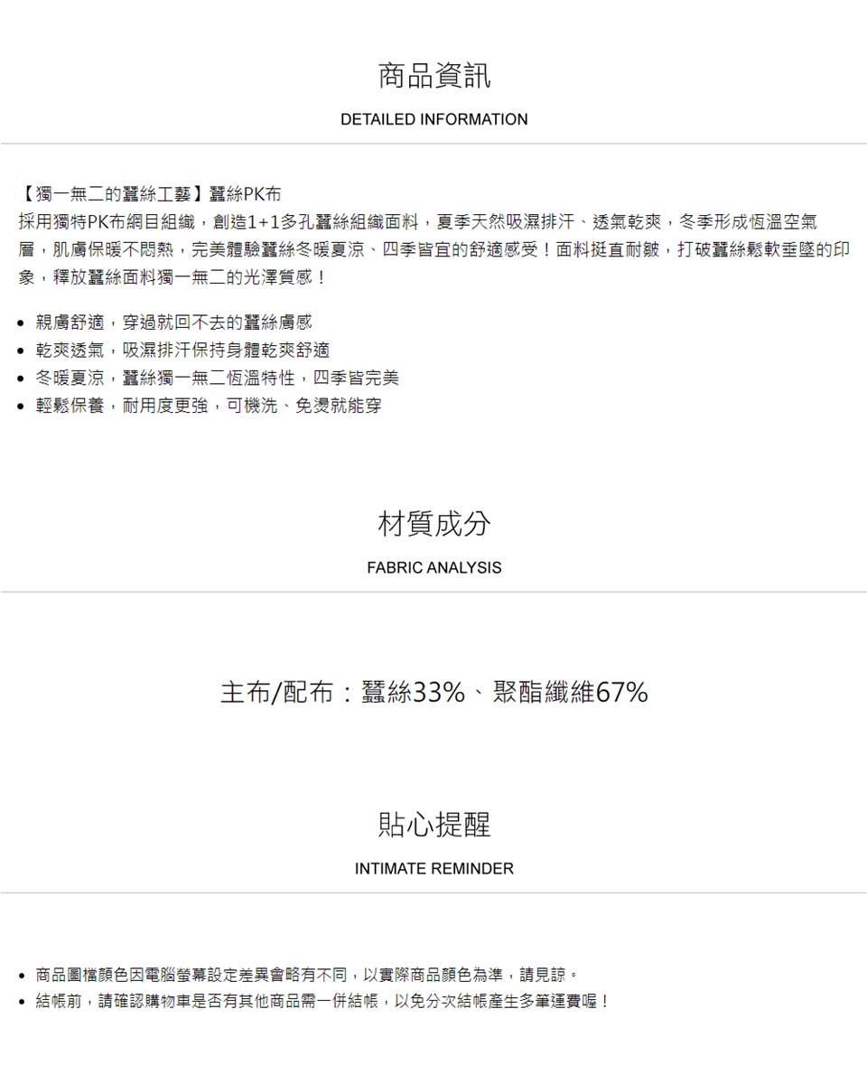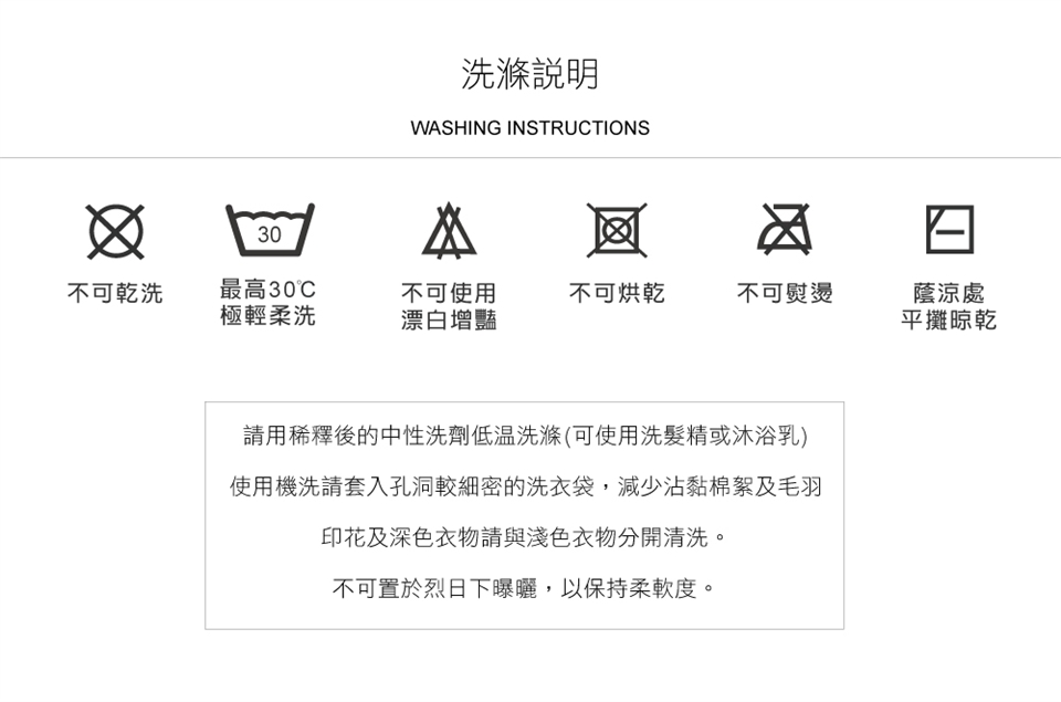 ► 請避免於太陽直射處曝曬,避免蠶絲纖維損壞。