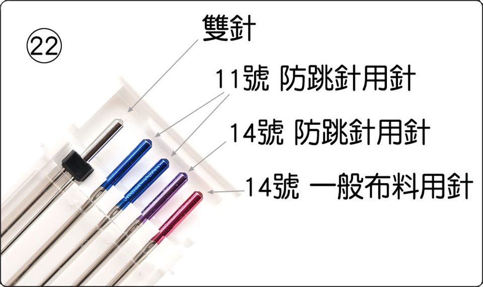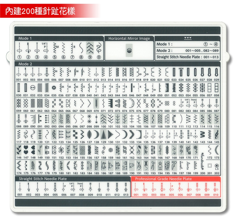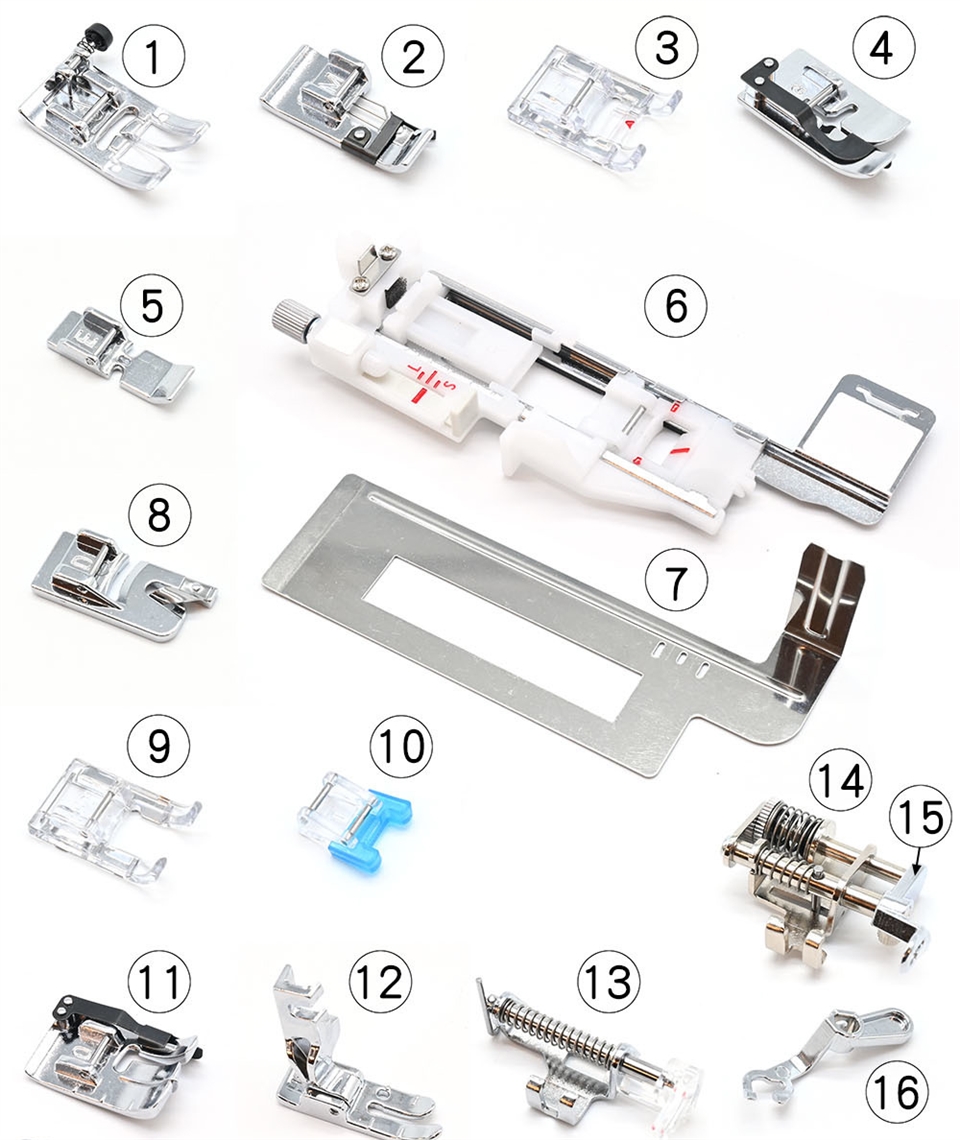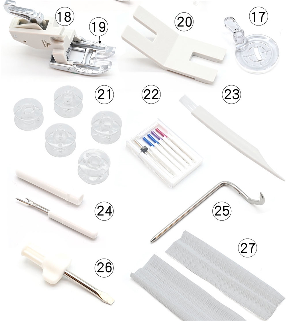 1、基本壓布腳A (已安裝在縫紉機上),2、布邊縫壓布腳M,3、密針縫壓布腳F,4、暗針縫壓布腳G,5、拉鍊壓布腳E,6、自動開釦眼壓布腳R,7、安定板,8、捲邊壓布腳D,9、前開式密針縫壓布腳F2,10、縫鈕釦壓布腳T,11、1/4"直線壓布腳O,12、專業級壓布腳HP,13、曲線壓布腳 PD-H,14、曲線壓布腳 QB-S,15、閉口型壓布腳,16、開口型壓布腳,17、透明圓盤壓布腳,18、上送料壓布腳脛,19、上送料壓布腳AD,20、鈕釦輔助板,21、梭子5個(1個安裝在縫紉機上),22、車針組,23、刷子,24、拆線刀,25、壓線導縫器,26、螺絲起子,27、線輪網2個,28、線輪蓋板(大)2個,29、線輪蓋板(小)2個,30、線輪蓋板(特殊)2個,31、線輪架2個,32、膝控抬桿,33、針板(已安裝在縫紉機上),34、直線針板,35、專業級針板