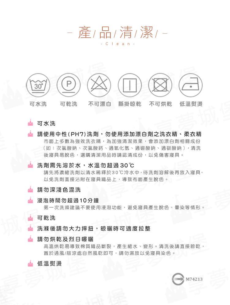 .建議清洗方式:將水置入洗衣機倒入中性清潔劑,再放入寢具商品,以弱速水洗與弱速脫水,自然風乾即可。