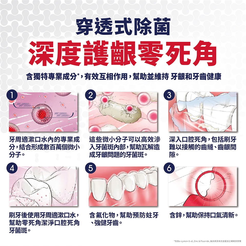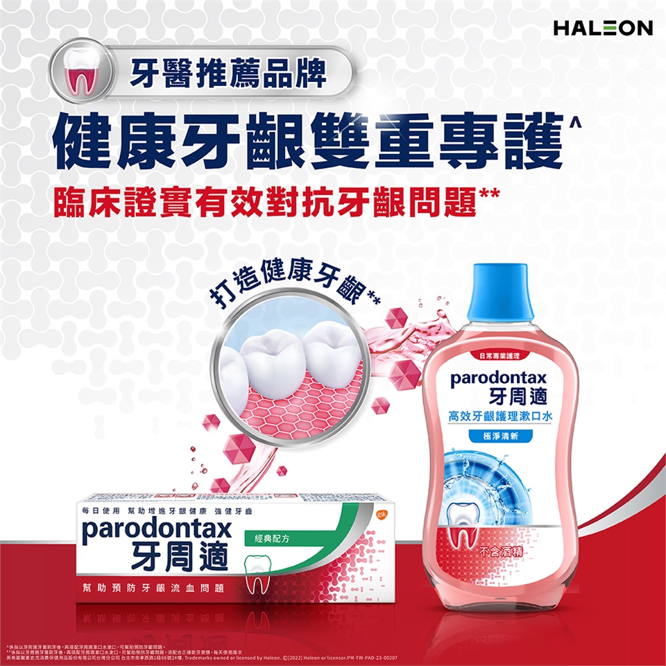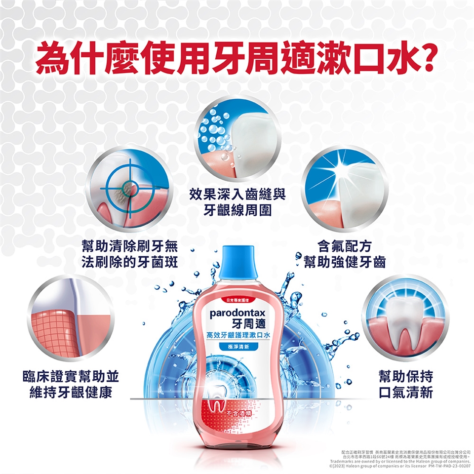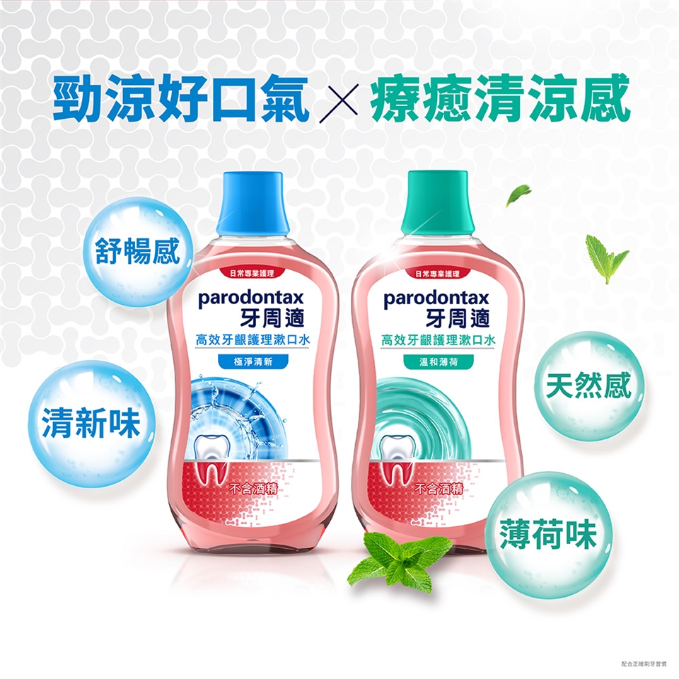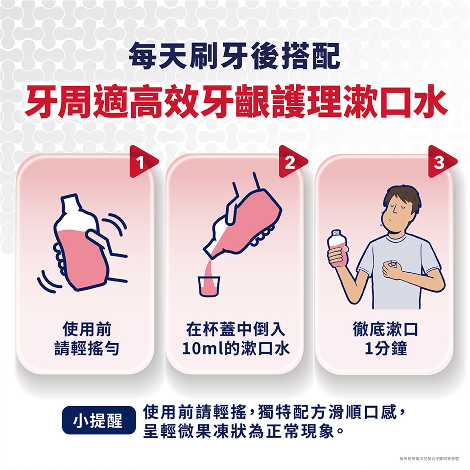 2.每日兩次,每次用10毫升漱口水漱口1分鐘後吐出。