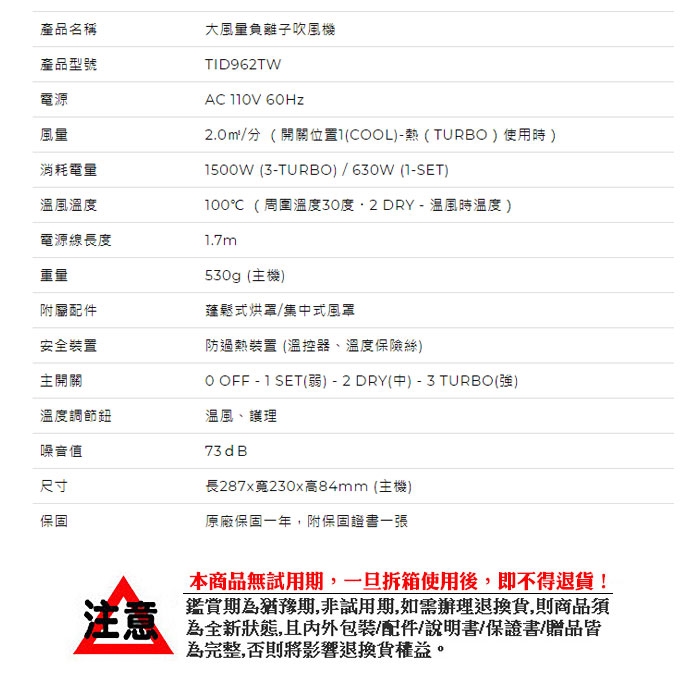 【日本TESCOM】大風量負離子吹風機 TID962TW