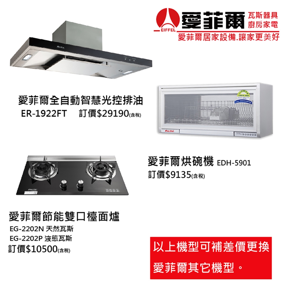★廚房三機可補差價更換其他同商品屬性愛菲爾機型。例如原方案搭配EDH-5901烘碗機,可換成EDG-5611烘碗機,