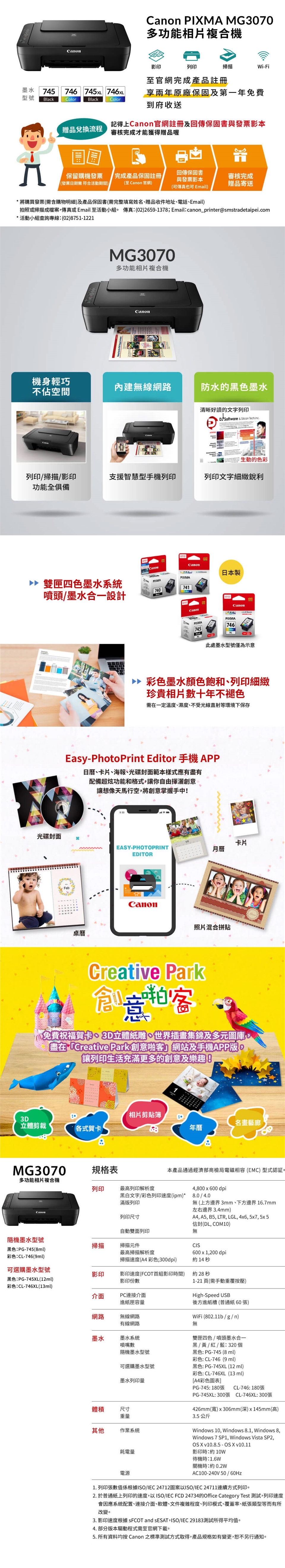 CANON MG3070 多功能相片複合機