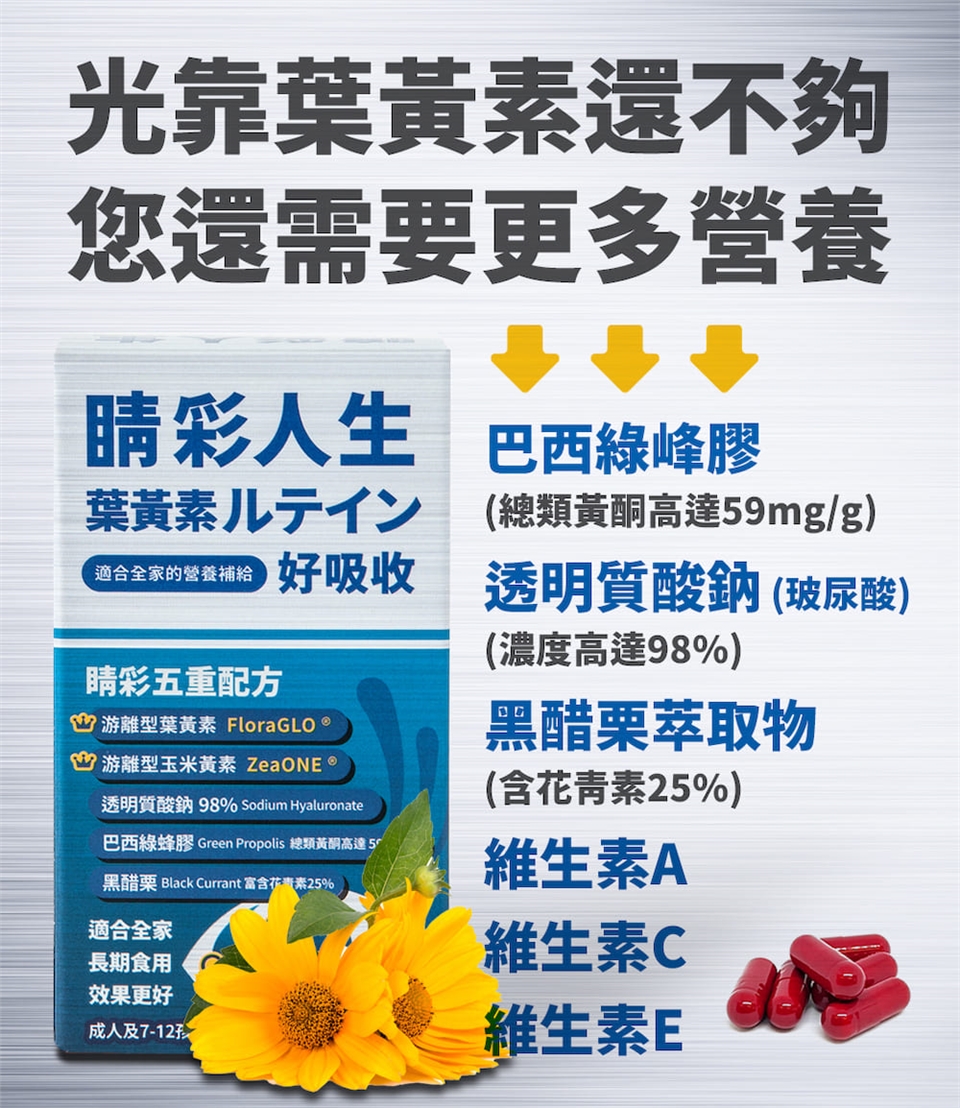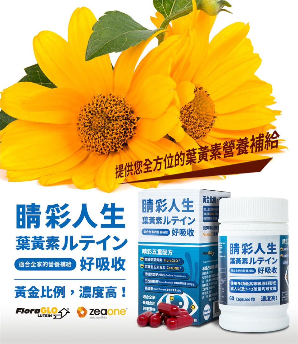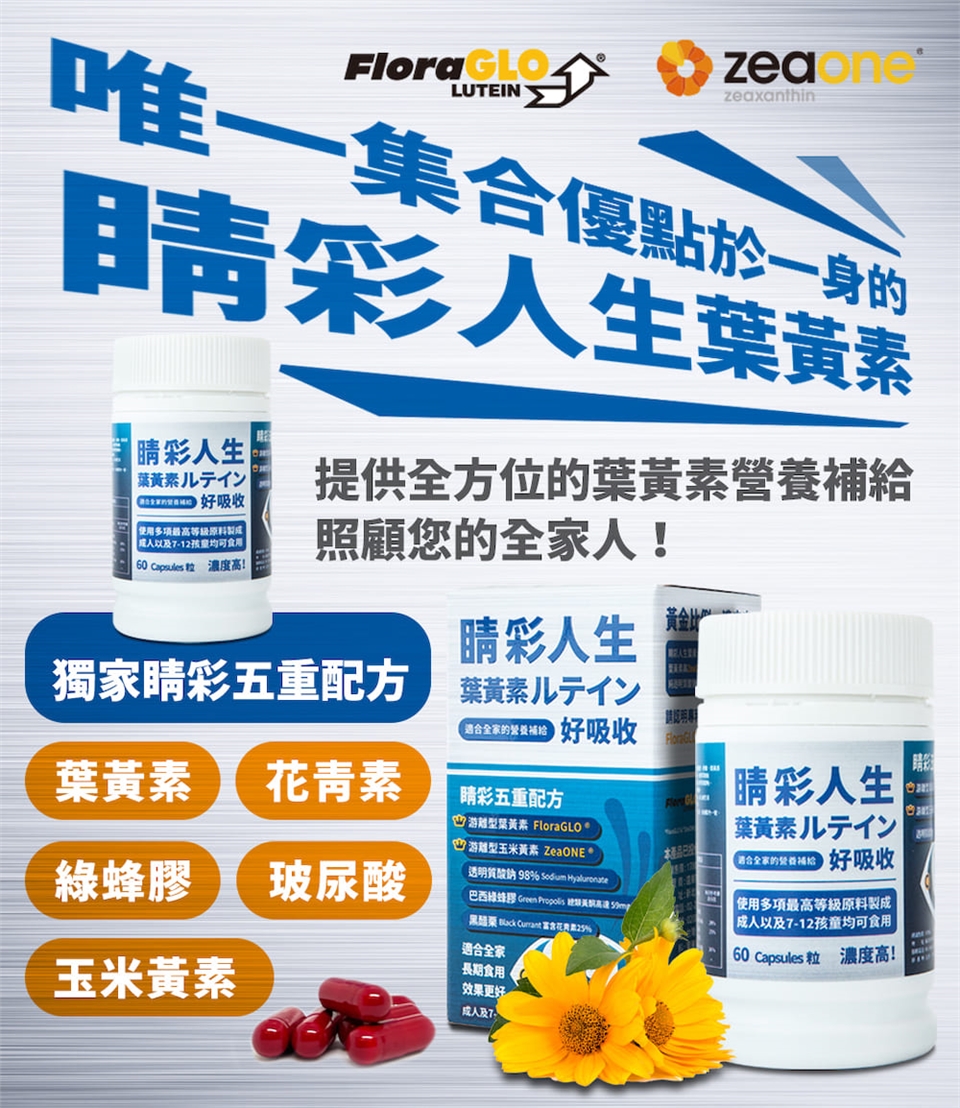 睛彩人生葉黃素是由五種配方所組成的高單位葉黃素保健食品,其原料含有:美國FloraGlo 游離型葉黃素、ZeaONE 游離型玉米黃素、透明質酸鈉(玻尿酸)、巴西綠蜂膠及黑醋栗,黃金比例10:2調配,好吸收,是適合您全家人的營養補給,也是適合小朋友的兒童葉黃素,全方位的葉黃素保健食品選擇,睛彩人生是您的最佳推薦。