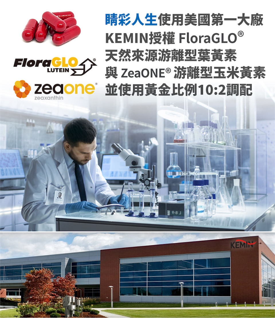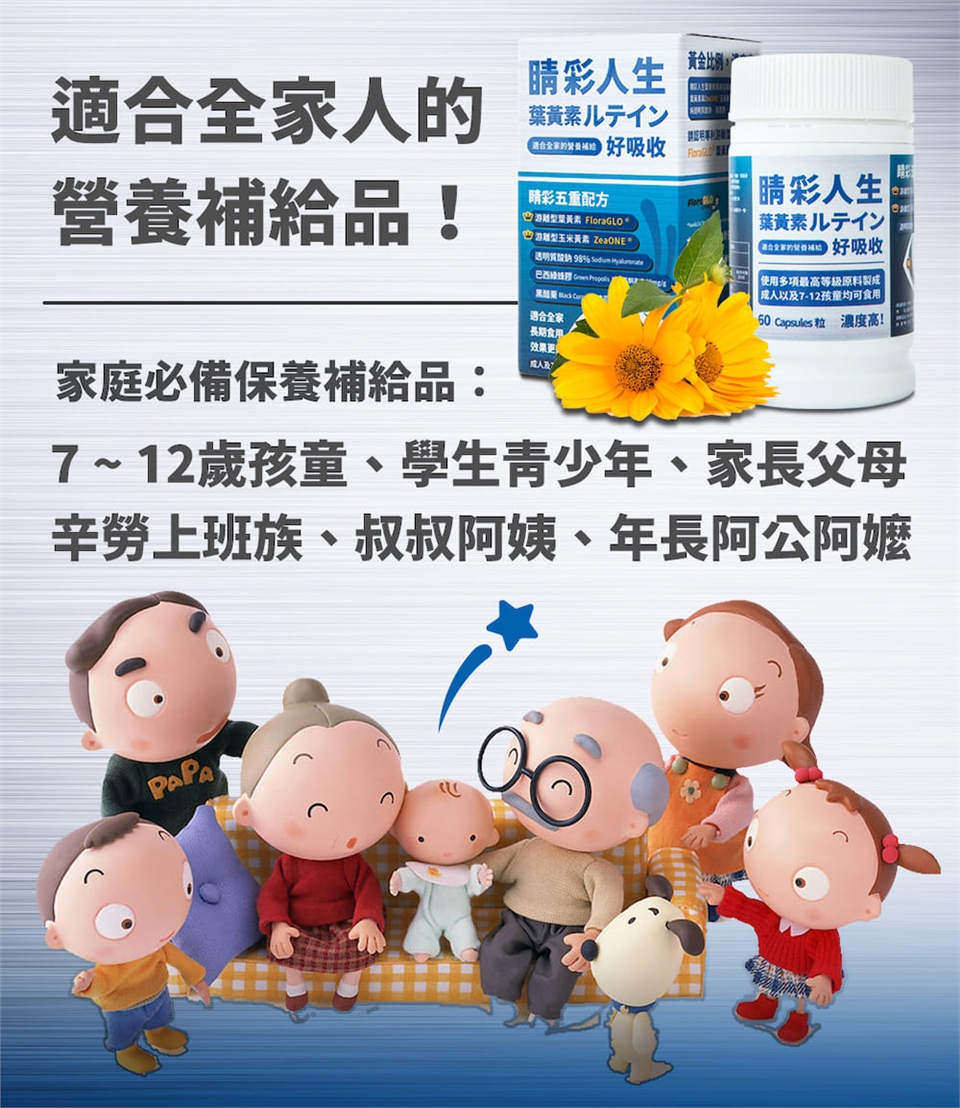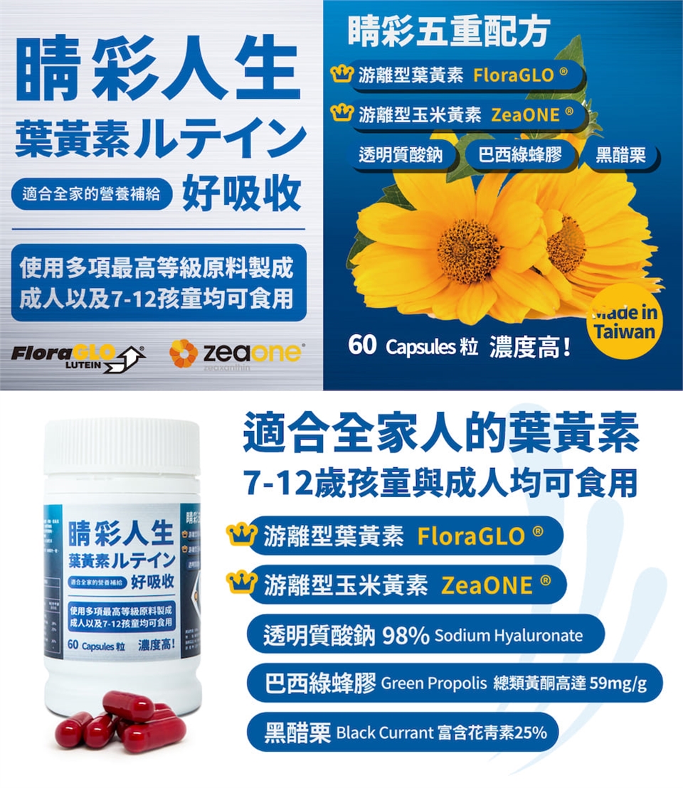 睛彩人生葉黃素是由五種配方所組成的高單位葉黃素保健食品,其原料含有:美國FloraGlo 游離型葉黃素、ZeaONE 游離型玉米黃素、透明質酸鈉(玻尿酸)、巴西綠蜂膠及黑醋栗,黃金比例10:2調配,好吸收,是適合您全家人的營養補給,也是適合小朋友的兒童葉黃素,全方位的葉黃素保健食品選擇,睛彩人生是您的最佳推薦。