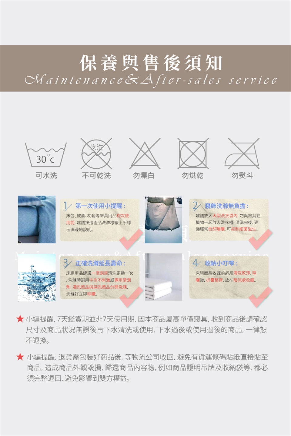*小編提醒,7天鑑賞期並非7天使用期,因本商品屬高單價寢具,收到商品後請確認尺寸及商品狀況無誤後再下水清洗或使用,下水過後或使用過後的商品,一律恕不退換。