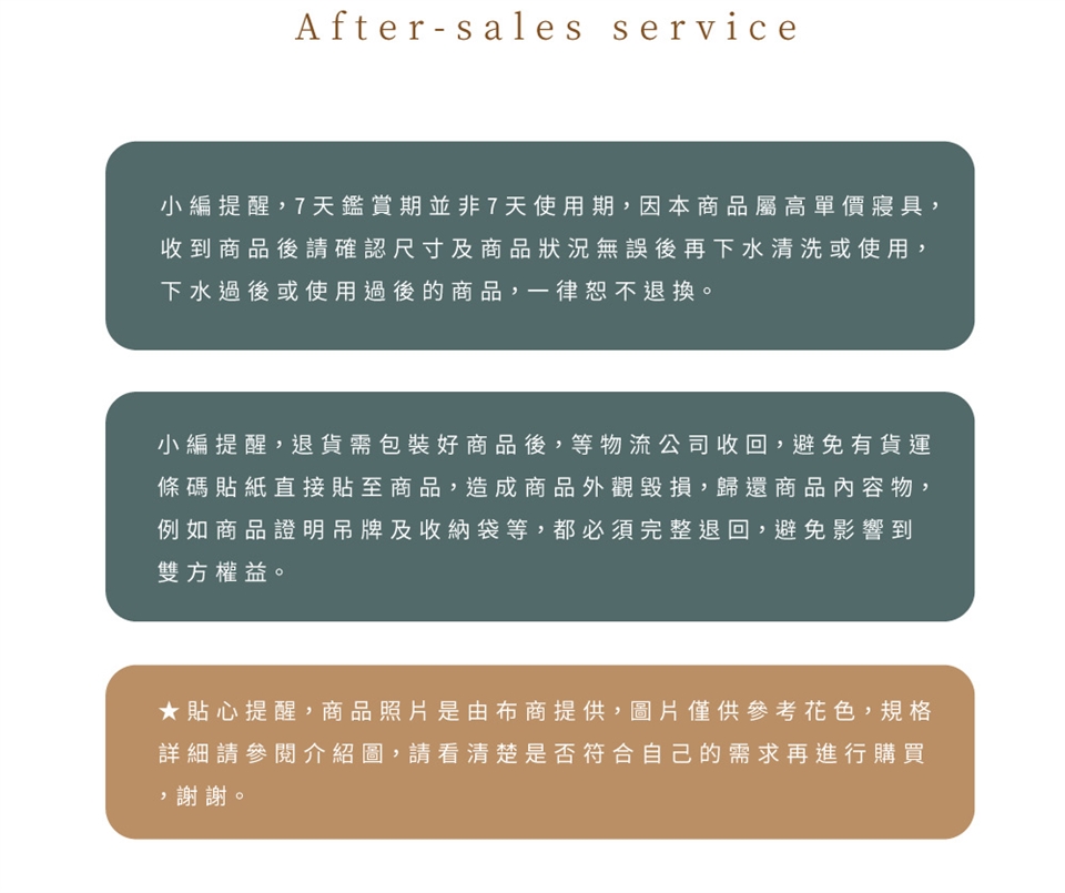 *小編提醒,7天鑑賞期並非7天使用期,因本商品屬高單價寢具,收到商品後請確認尺寸及商品狀況無誤後再下水清洗或使用,下水過後或使用過後的商品,一律恕不退換。