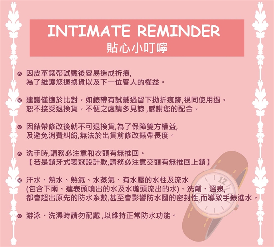■注意事項:洗手時,請務必注意龍頭有無推回【若是鎖牙式表冠設計款,請務必注意龍頭有無推回上鎖】。游泳或洗澡時請勿配戴,以維持其正常防水功能。