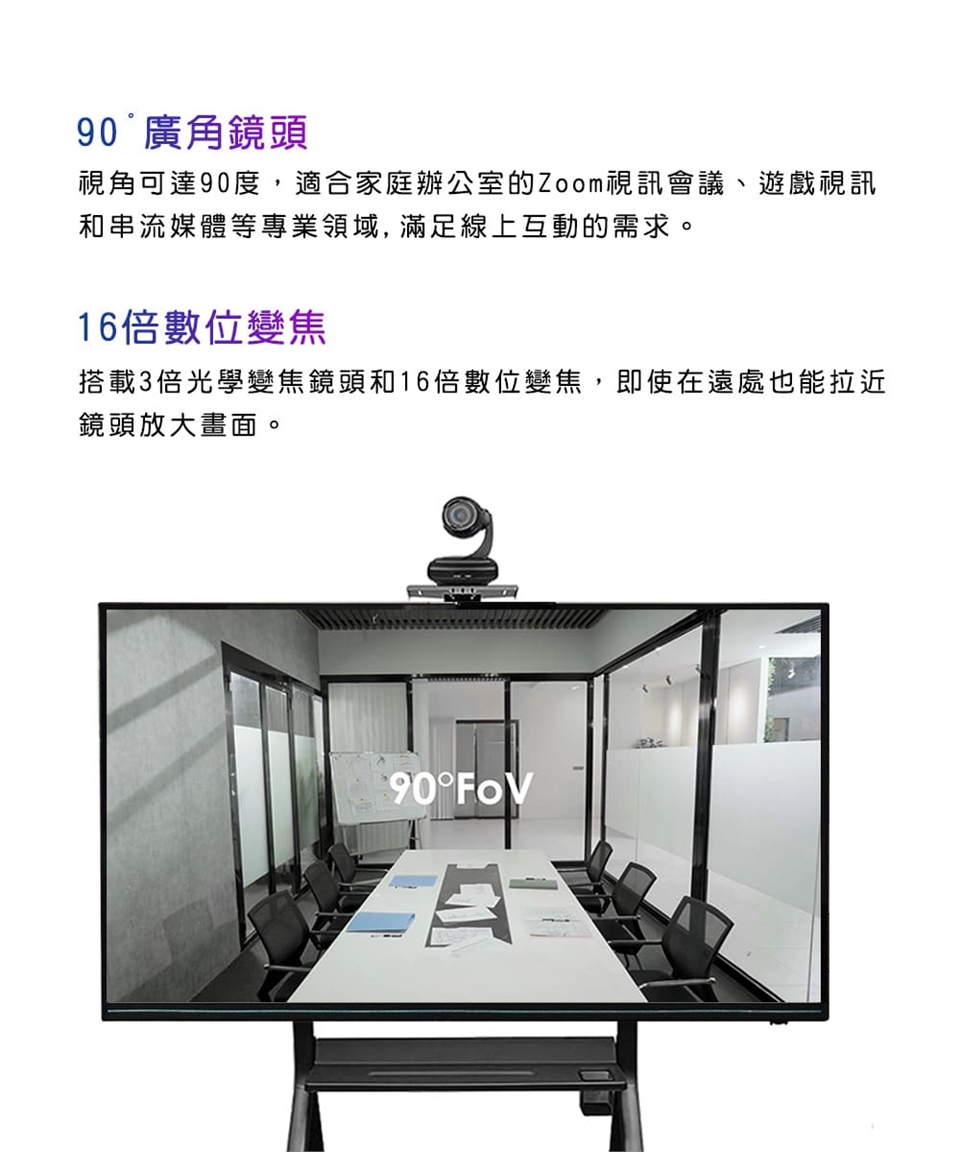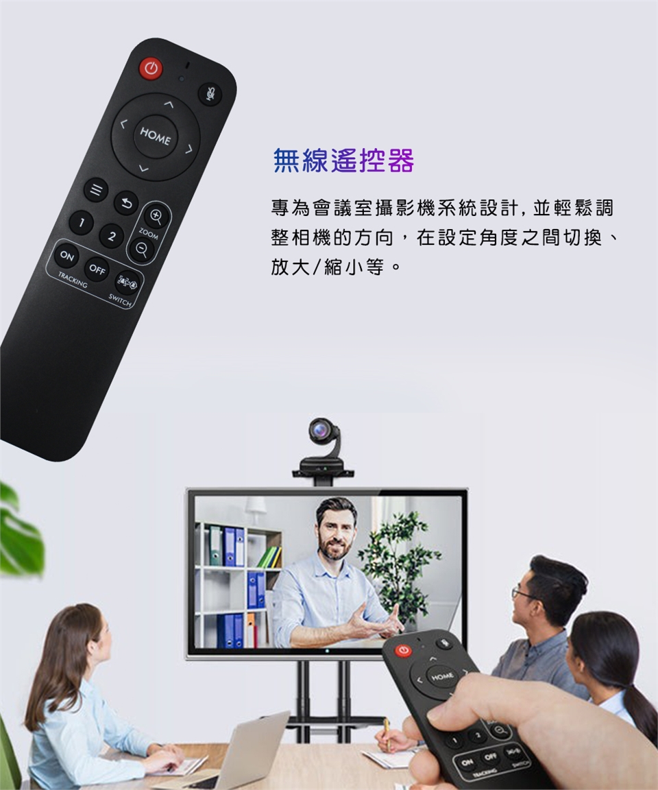 搭配無線遙控器,專為會議室攝影機系統設計,並輕鬆調整相機的方向。