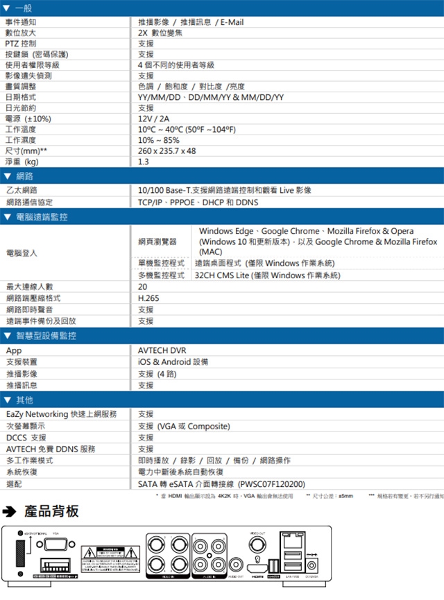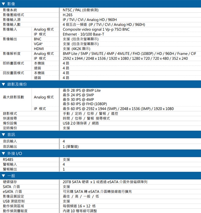 -錄影格式:數位訊號模式: 8MP Lite / 5MP / 5MLITE / 4MP / 4MLITE / FHD (1080P) / HD / 960H / Frame / CIF