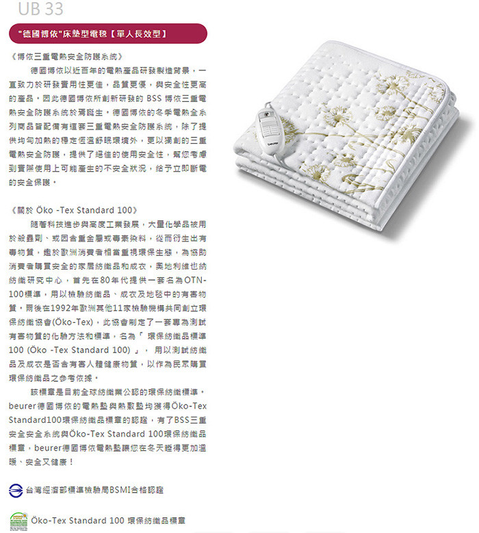 有了 BSS 三重電熱安全系統與 Öko-Tex Standard 100 環保紡織品標章,beurer 德國博依電熱墊讓您在冬天睡得更加溫暖、安全又健康!