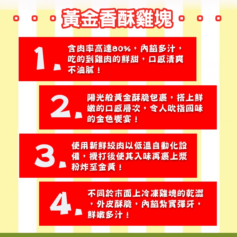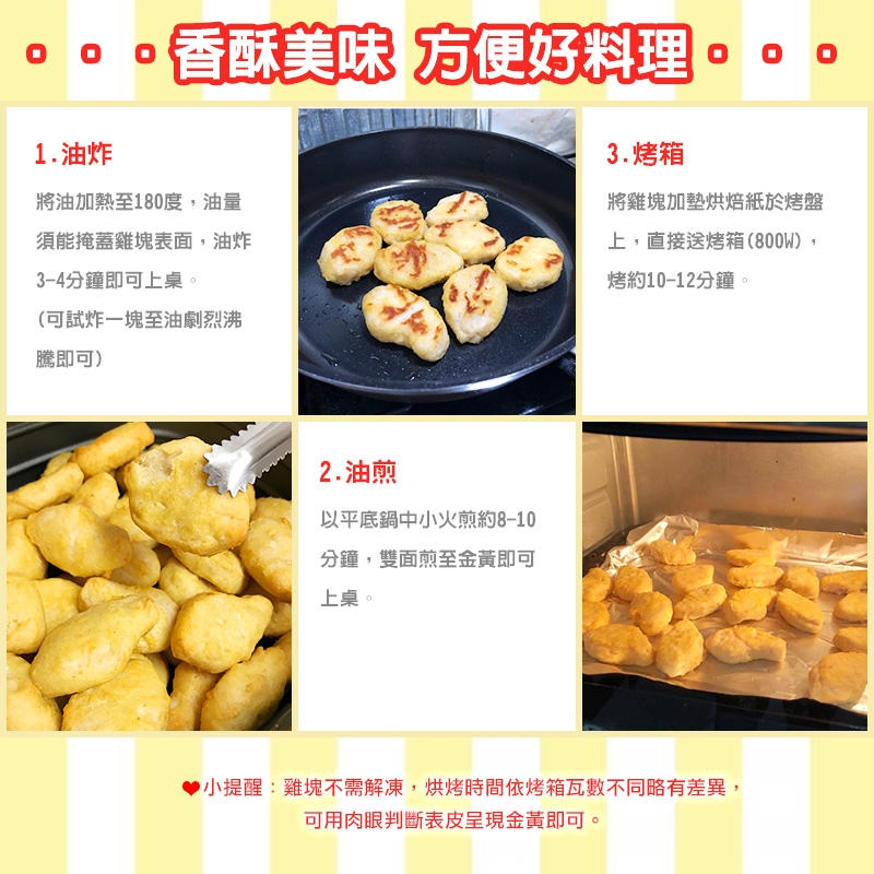 1.油炸:油預熱至180度,油量須蓋過雞塊表面,油炸3~4分鐘,炸至金黃色中心熟透即可上桌