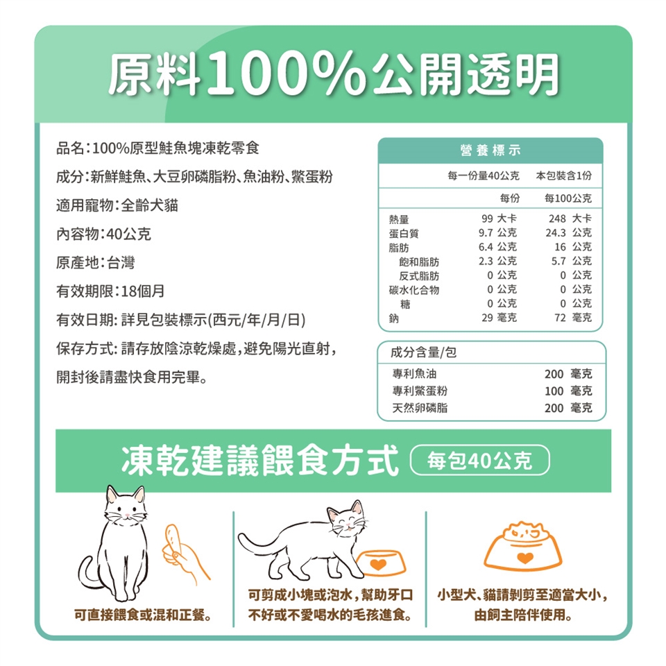 👉可以的。我們的凍乾零食製造全程天然無化學添加,保健成分亦是天然的魚油及鱉蛋粉,對狗狗貓咪都是非常好的天然零食。如果需要訓練狗狗,或是想購買切割成小塊凍乾的飼主,可以選購凍乾丁,小方塊狀更方便帶出門餵食及訓練用。