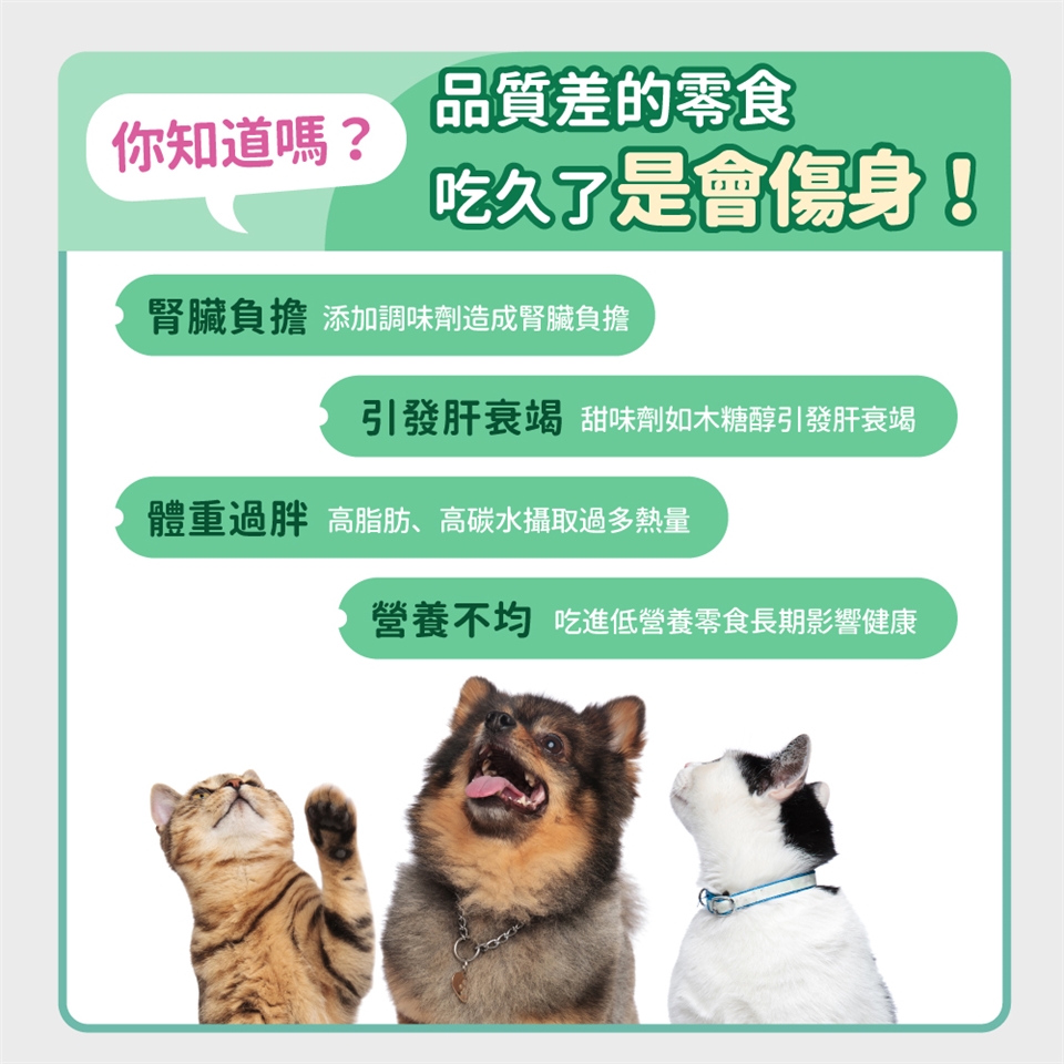 👉寵物零食成分與劑量標示不清的新聞層出不窮,因寵物零食製作門檻低,在家中即可自製寵物零食。然而,寵物零食用料及過程非常不透明,極少數廠商願意公開使用的原料。為了讓我們的毛孩連零食都能吃得健康,我們研發出「市售營養價值最高寵物零食」,透明公開所有成分及保健品添加量,做出連我們自己的毛孩也每天吃的寵物零食。