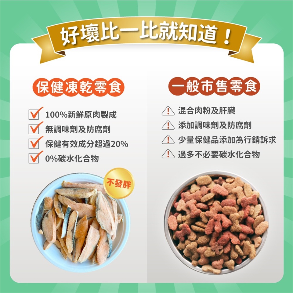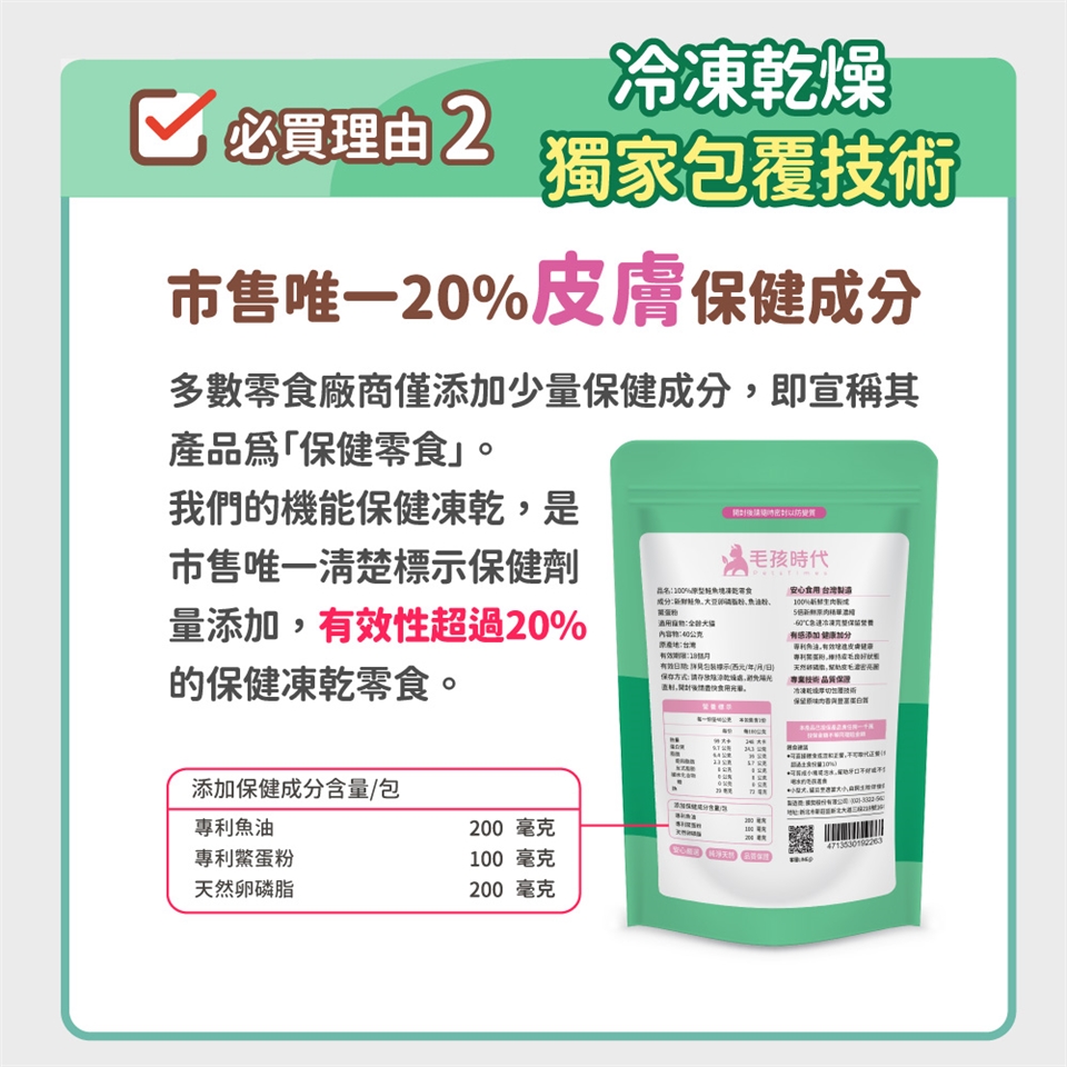 👉毛孩時代的凍乾零食,保健成分有效性高達20%,是市場上保健營養成分最高的寵物零食。如果凍乾不是每天大量食用(亦不建議每日大量攝取凍乾零食,可能因為吃不下其他食物造成營養不均衡),較難吃到每天建議保健食品用量。因此,為了達到保健健康需求,建議可以另外搭配保健食品。
