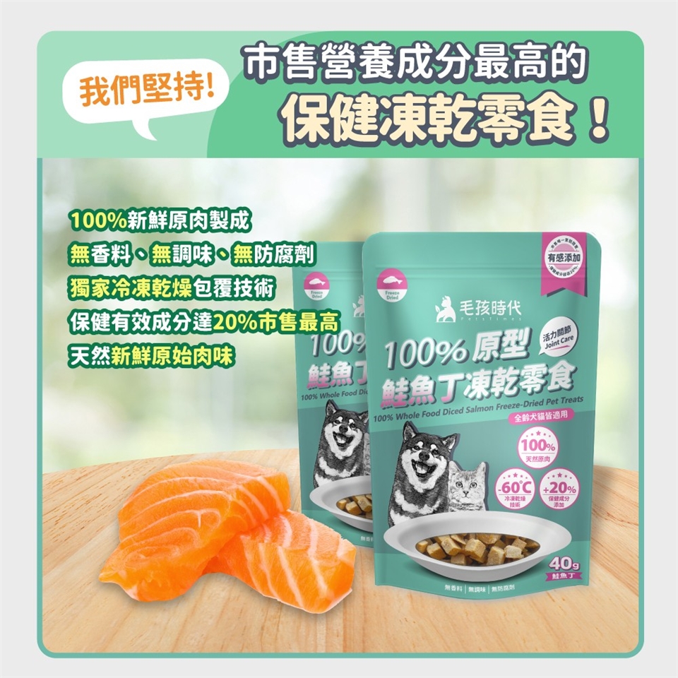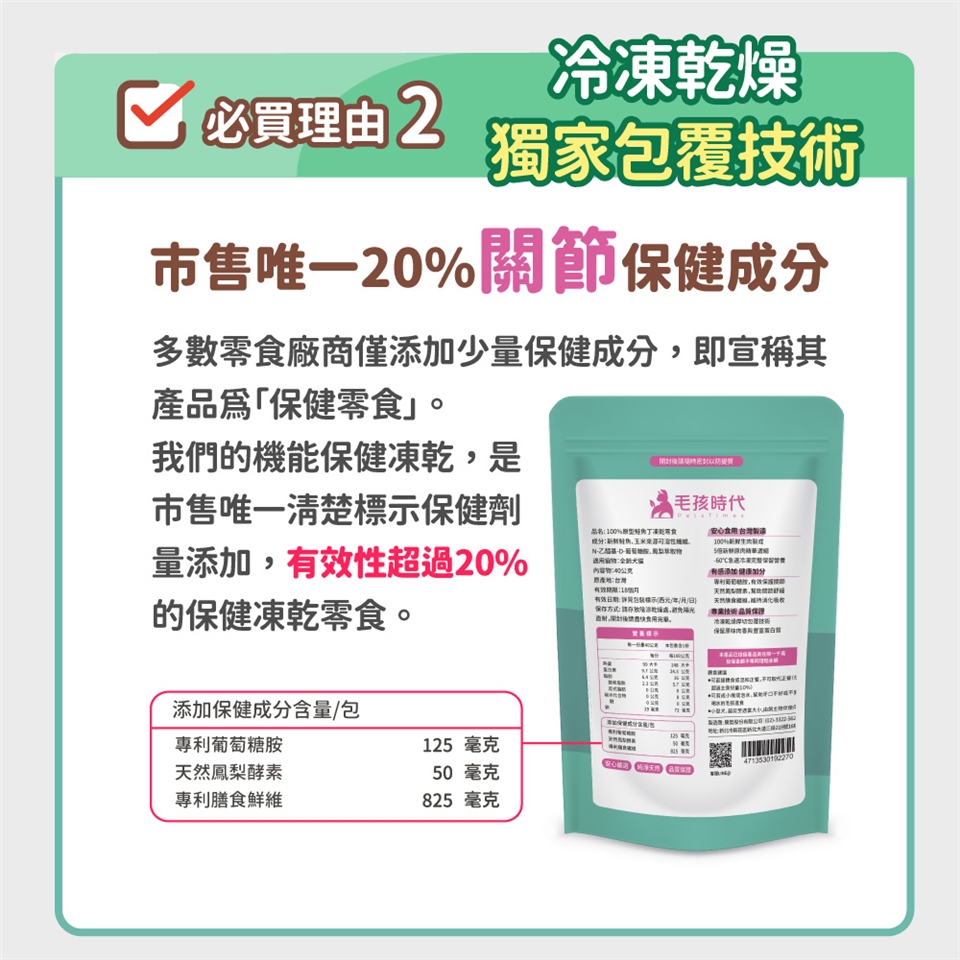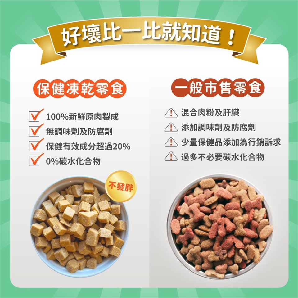👉毛孩時代的凍乾零食,保健成分有效性高達20%,是市場上保健營養成分最高的寵物零食。如果凍乾不是每天大量食用(亦不建議每日大量攝取凍乾零食,可能因為吃不下其他食物造成營養不均衡),較難吃到每天建議保健食品用量。因此,為了達到保健健康需求,建議可以另外搭配保健食品。