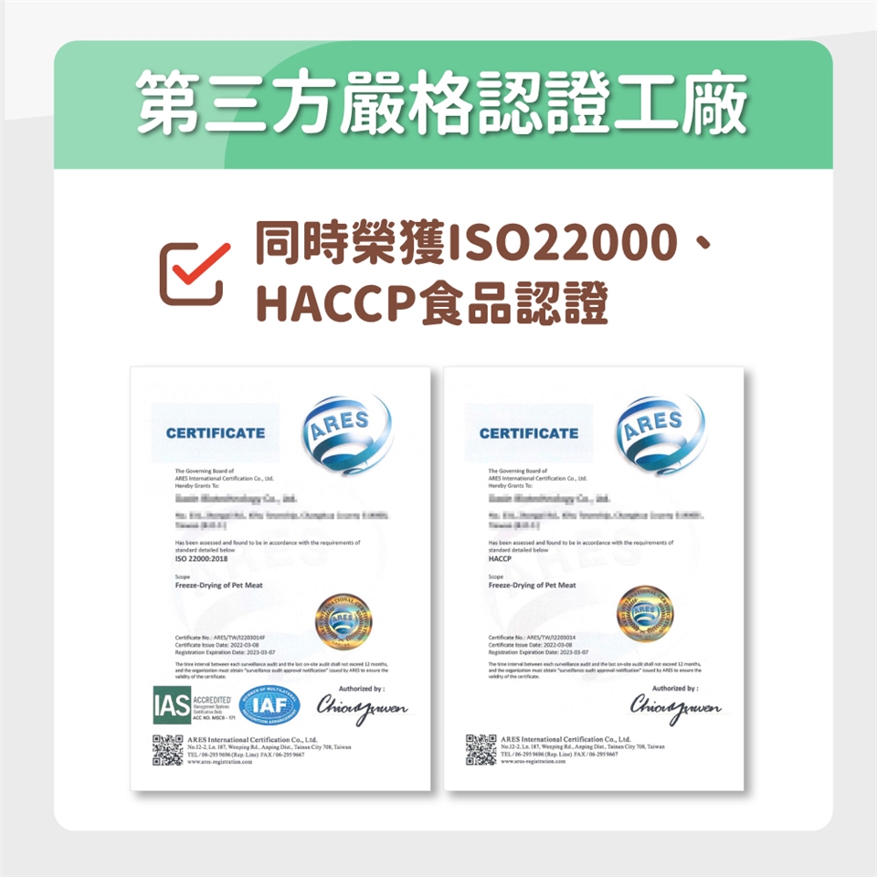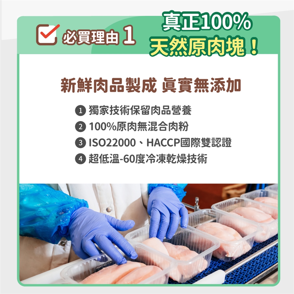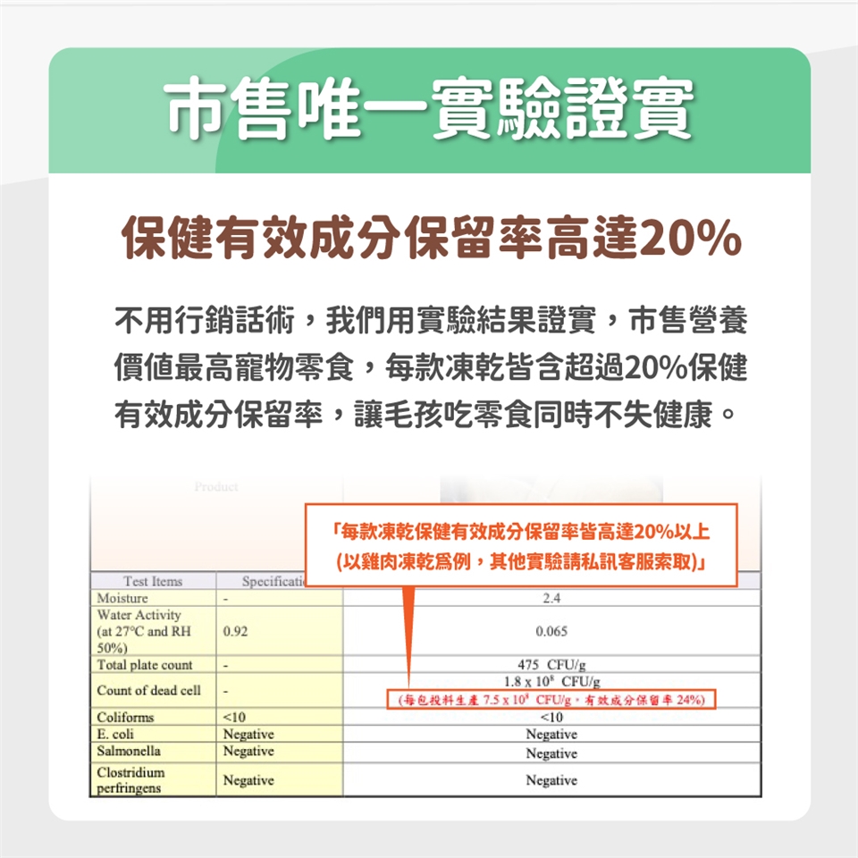 👉我們研發超過半年,終於做出營養保健成分含量高達20%的凍乾零食,使用的是市場獨家冷凍包覆技術,讓保健粉有效結合天然原肉,做出市售保健營養成分最高寵物零食。
