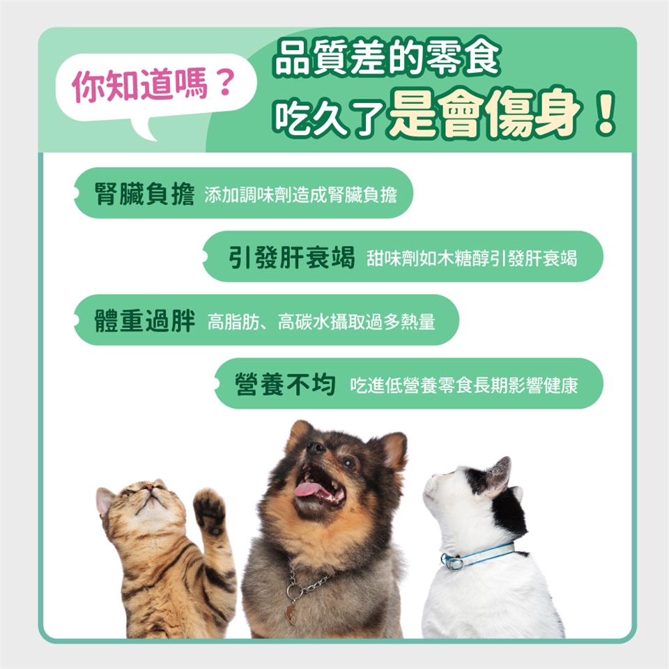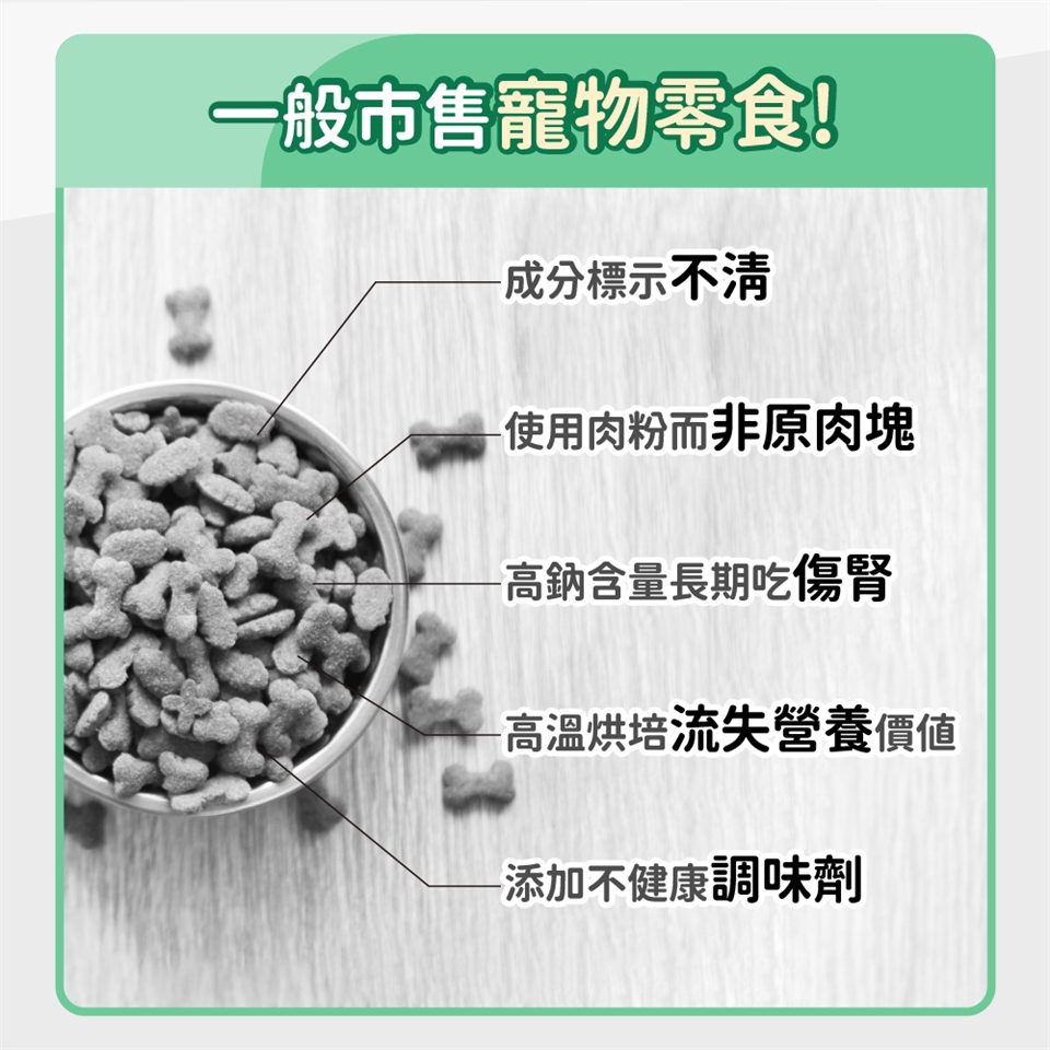 👉寵物零食成分與劑量標示不清的新聞層出不窮,因寵物零食製作門檻低,在家中即可自製寵物零食。然而,寵物零食用料及過程非常不透明,極少數廠商願意公開使用的原料。為了讓我們的毛孩連零食都能吃得健康,我們研發出「市售營養價值最高寵物零食」,透明公開所有成分及保健品添加量,做出連我們自己的毛孩也每天吃的寵物零食。