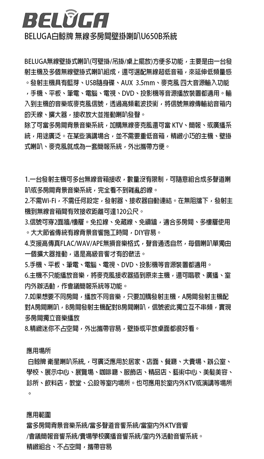 BELUGA白鯨牌 U650B 無線壁掛音響喇叭美聲組