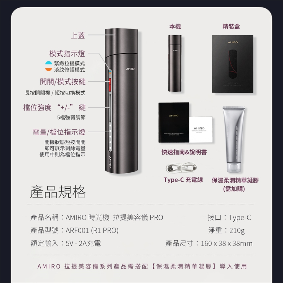 品名:【AMIRO】時光機拉提美容儀 R1 PRO(贈專用凝膠1條) + 保濕柔嫩精華凝膠 2入