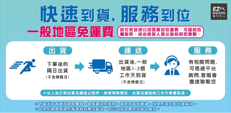 ※ 配送時間預計需要2-5個工作天(不含假日)。