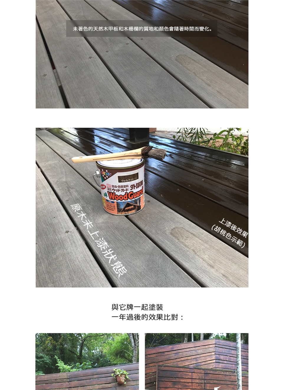 5.塗刷後可留下渾厚的平光效果。如無需防蟲防霉僅需塗刷透明色面時,建議使用超耐久保護清漆能更長期抵抗強烈日曬雨淋。