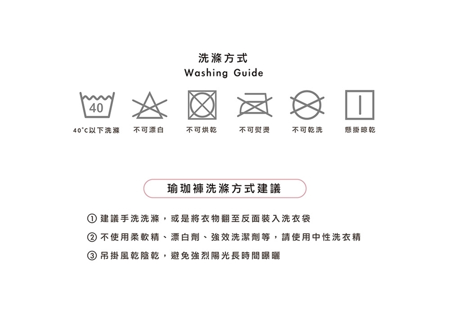 - 建議以清水手洗最佳,流汗後請盡快清洗晾乾或保持通風。