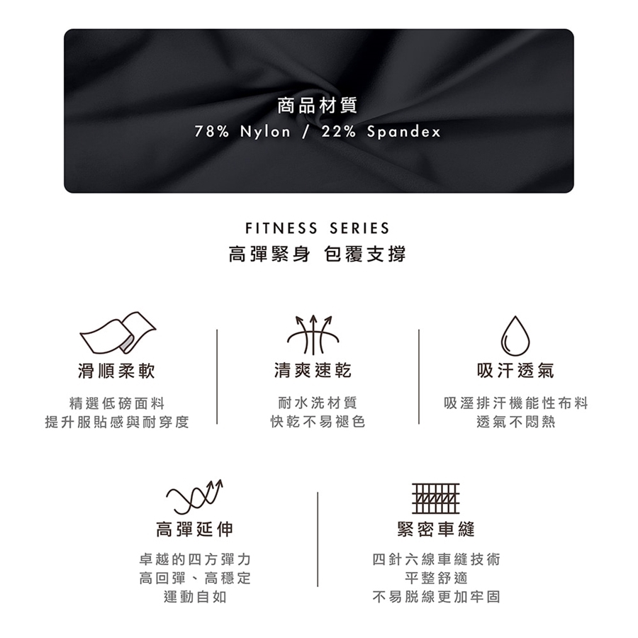 - 高彈纖維提升布料的服貼度,高延展性又能貼身包覆。