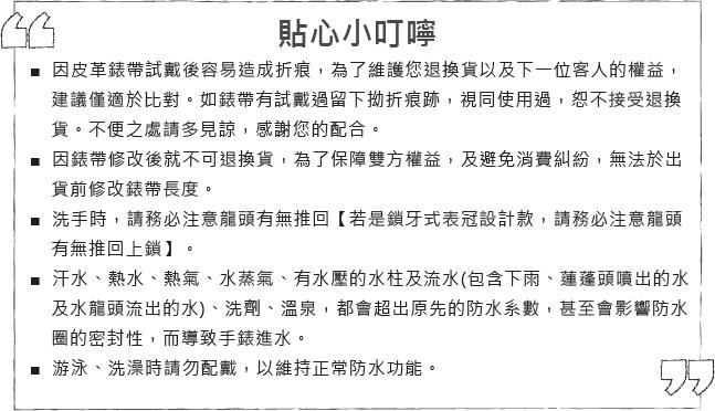 ■注意事項:洗手時,請務必注意龍頭有無推回【若是鎖牙式表冠設計款,請務必注意龍頭有無推回上鎖】。游泳或洗澡時請勿配戴,以維持其正常防水功能。