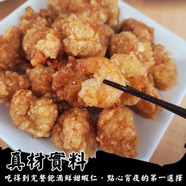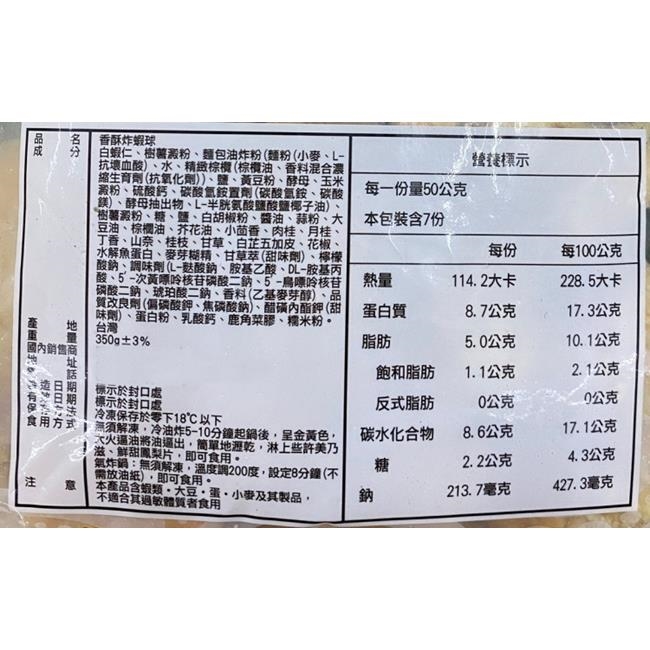 成分:白蝦仁、樹薯澱粉、麵包油炸粉(麵粉(小麥、L-抗壞血酸)、水、精製棕欖(棕欖油、香料混合濃縮生育劑(抗氧化劑))、鹽、黃豆粉、酵母、玉米澱粉、硫酸鈣、碳酸氫胺置劑(碳酸氫胺、碳酸鎂)、酵母抽出物、L-半胱胺酸鹽酸鹽椰子油)、樹薯澱粉、糖、鹽、白胡椒粉、醬油、蒜粉、大丁香、山奈、桂枝、甘草、白芷五加皮、花椒、水解魚蛋白、麥芽糊精、甘草萃(甜味劑)、檸檬酸鈉、調味劑(L-麩酸鈉、胺基乙酸、DL-胺基丙酸、5'-次黃嘌呤核苷磷酸二鈉、5'-鳥嘌呤核苷磷酸二鈉、琥珀酸二鈉、香料(乙基麥芽醇)、品質改良劑(偏磷酸鈉、焦磷酸鈉)、醋磺內酯鉀(甜味劑)、蛋白粉、乳酸鈣、鹿角菜膠、糯米粉