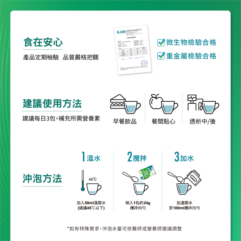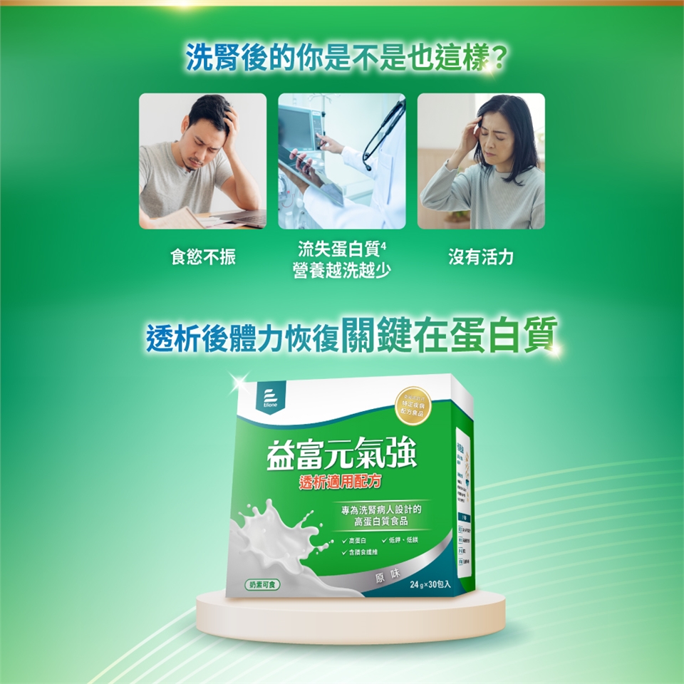 ●本產品專為洗腎病人設計之營養調整補充配方食品,提高蛋白質,減少碳水化合物、鎂、鋅及碘