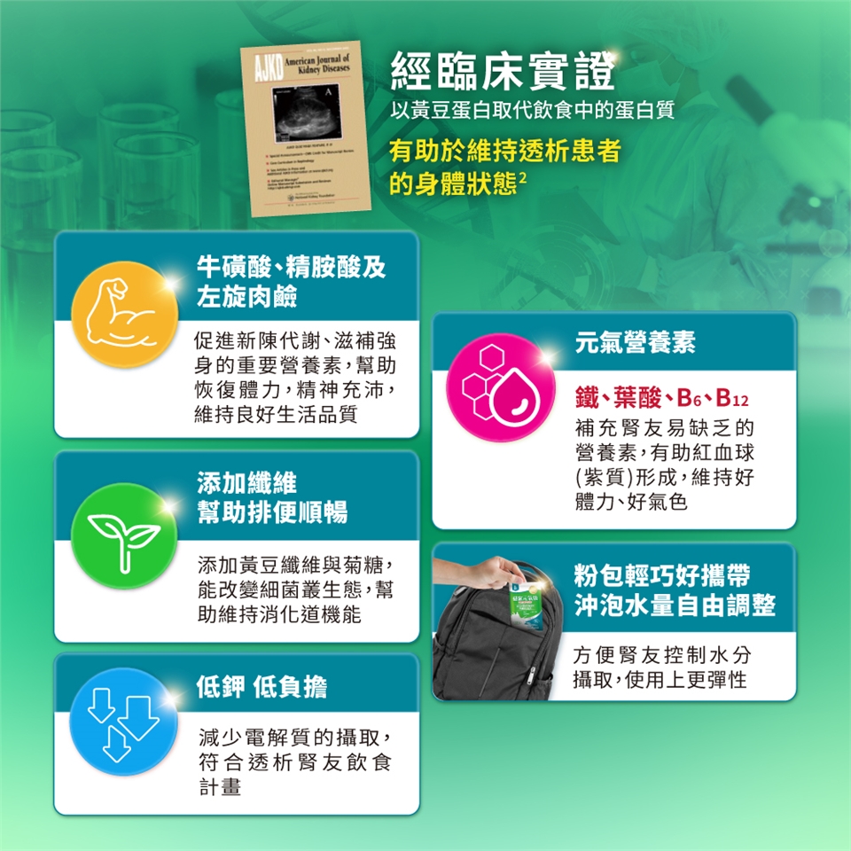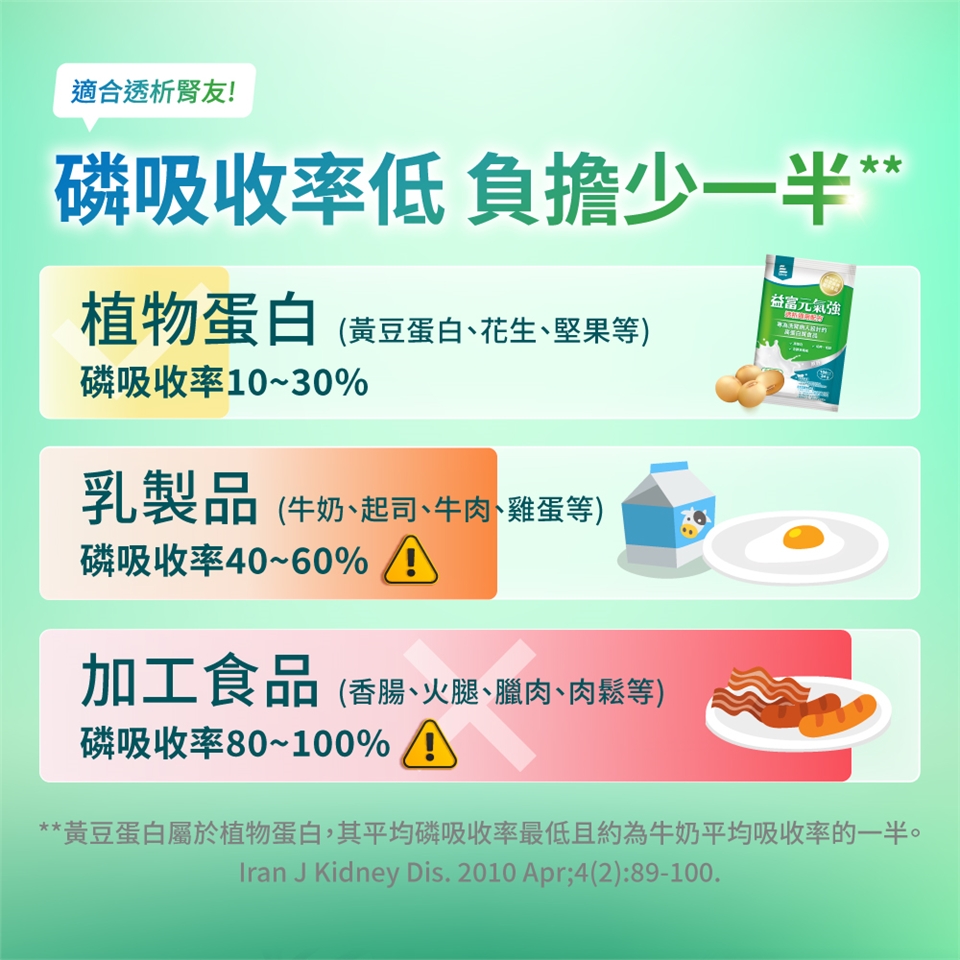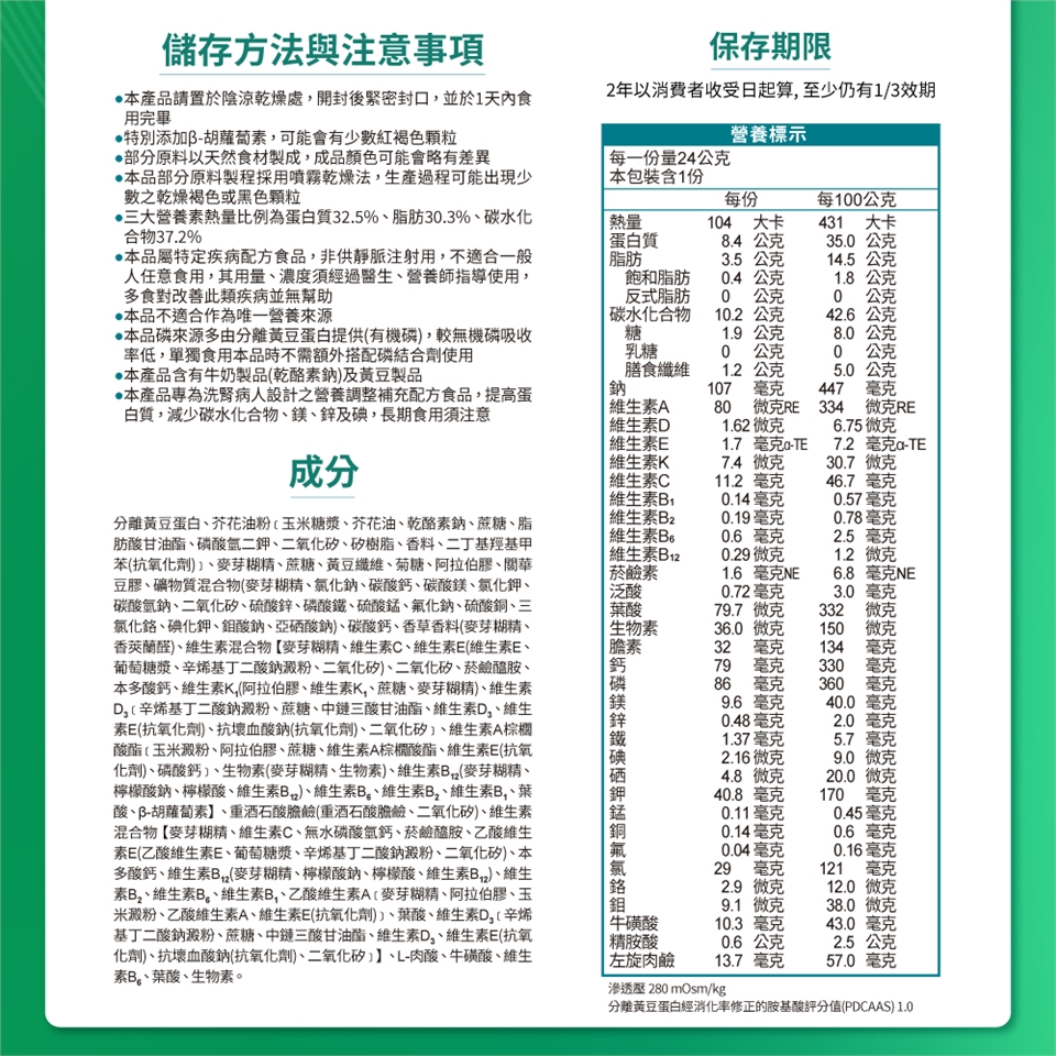 ●本品磷來源多由分離黃豆蛋白提供(有機磷),較無機磷吸收率低,單獨食用本品時不需額外搭配磷結合劑食用