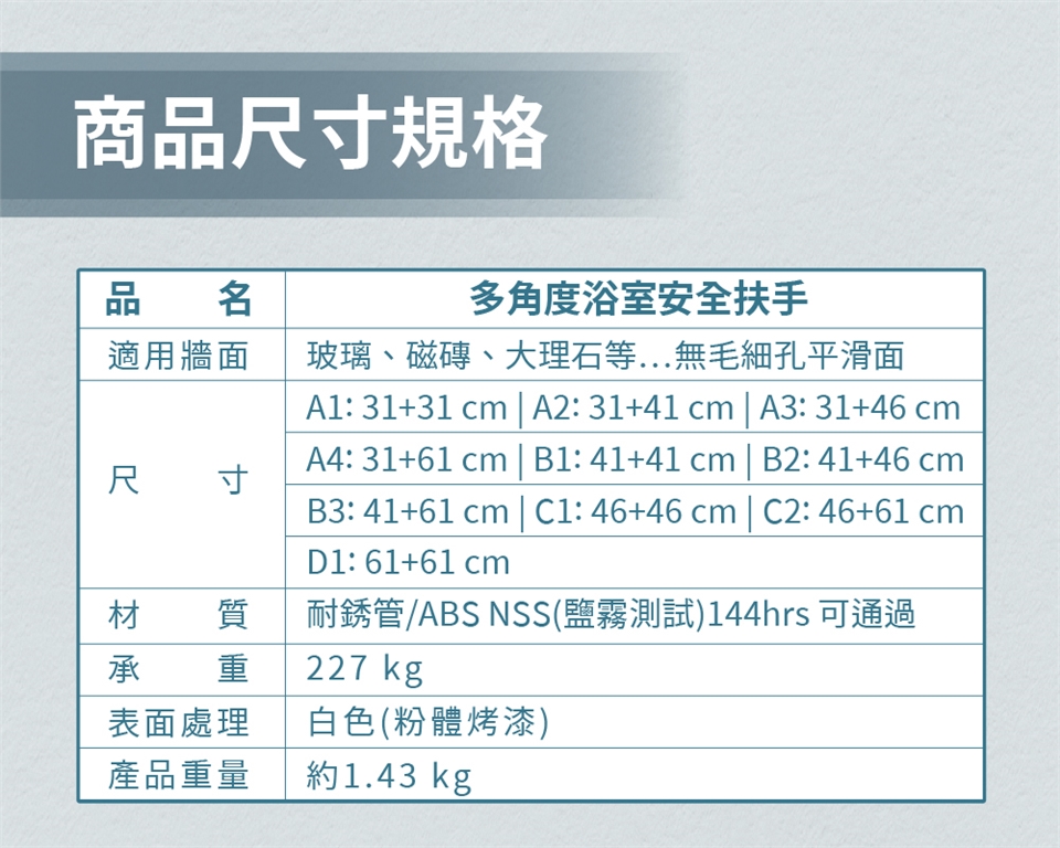 ◆ 多款規格:多款尺寸規格,量身打造安全浴室環境。