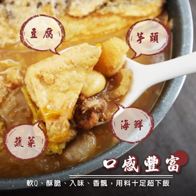 成分:鮭魚頭切片、大白菜、芋頭、油豆腐【非基改黃豆】、沙茶醬【大豆沙茶油、魚乾、蒜頭、南薑粉、椰子粉、蔥乾、芝麻、赤尾青、辣椒粉、食鹽、咖哩粉、胡椒】、小貢丸【豬肉(台灣)、高湯(水、貢丸)、蔗糖、小麥蛋白、食鹽、大豆油、芝麻油、蒜頭、白胡椒粉】、爆皮【炸過豬皮(台灣)】、扁魚乾、蒜仁、蛋酥【蛋】、金針花、冬蝦、白胡椒粉【麥芽糊精、麩皮粉、玉米澱粉、綠辣椒、八角、胡椒(11%)、雞心椒、茶枝、當歸】