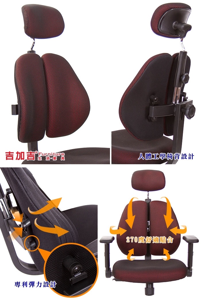 人體工學雙背設計,改善長時間座在椅子上,覺得腰部貼合度不足,有懸空或不夠沉穩的感覺,改良式的雙背背墊,除了完整包覆性外,更提供了『左右彈性』、『上下貼合』、『彈力緩衝』等特性,並有多國國際結構專利認證(台灣、德國、日本、美國、中國等),原廠專利、技術100% Made in Taiwan台灣製造。