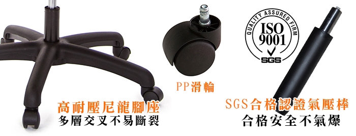電腦椅透過『氣壓棒』來調整坐墊升降功能,調至個人最舒適座面高度,且台灣生產的氣壓棒,通過合格安全認證,品質良好、耐用,不會有氣爆、爆炸的問題。
